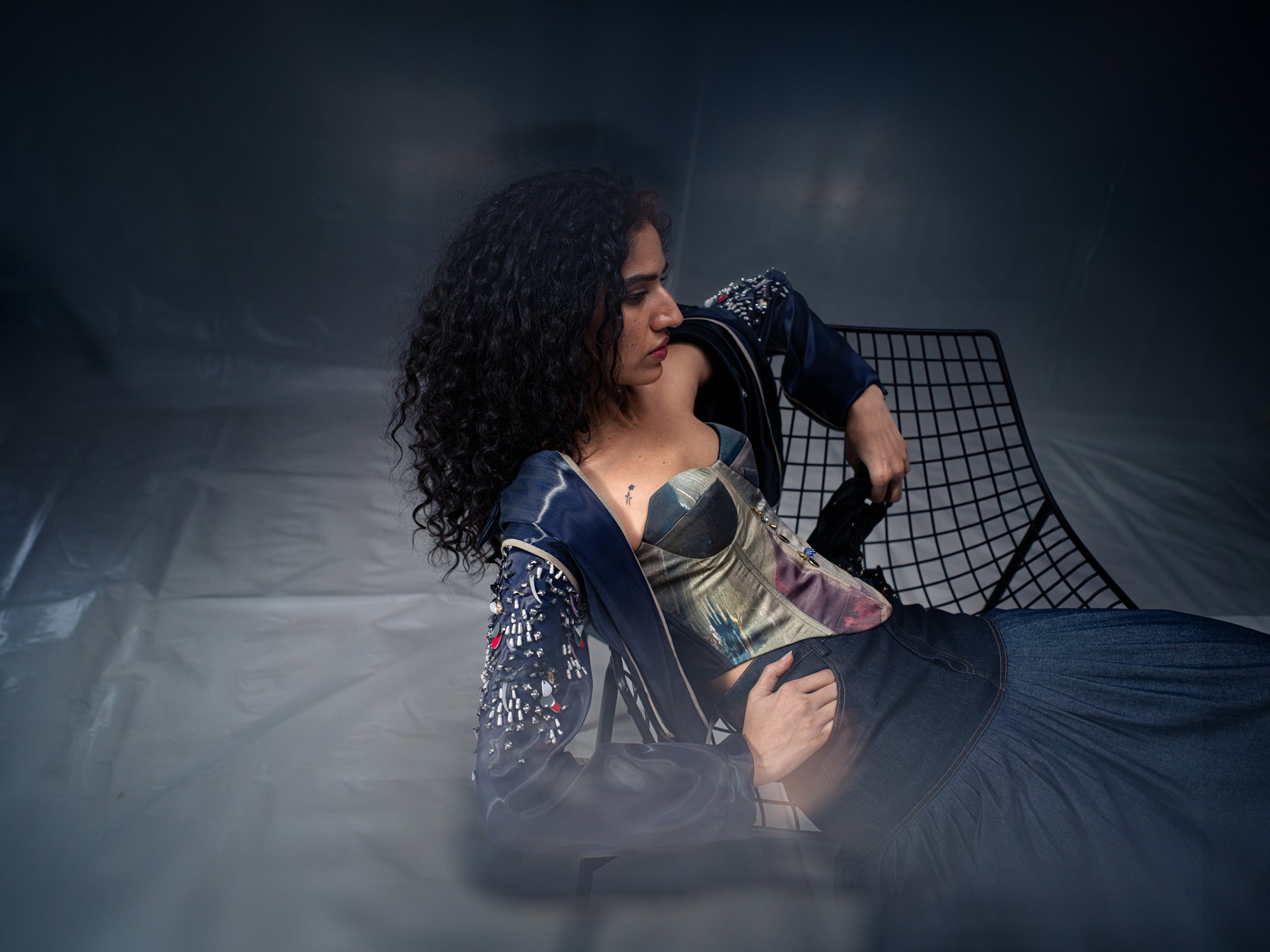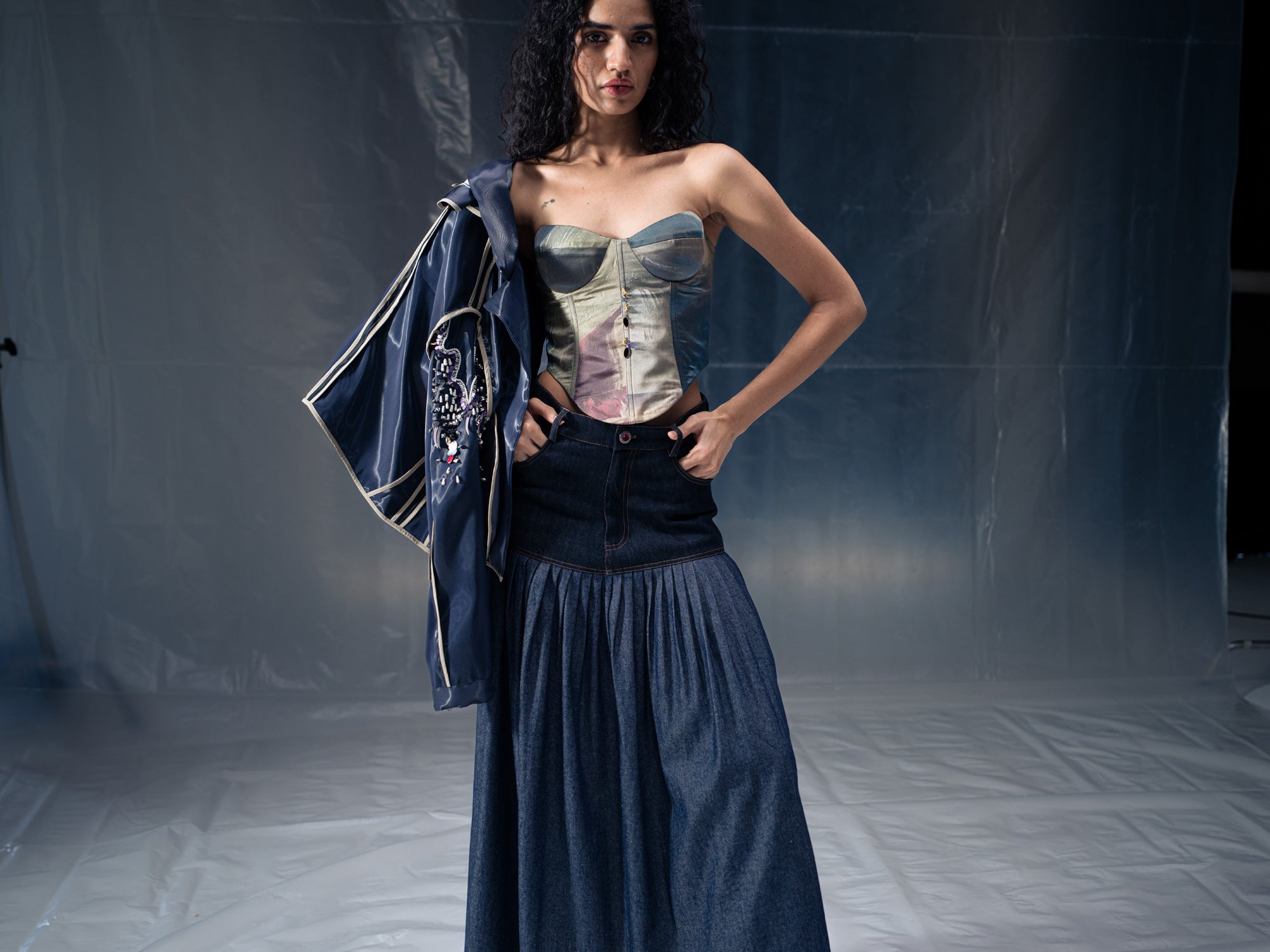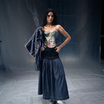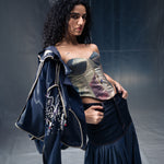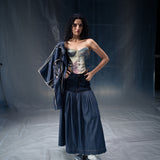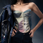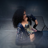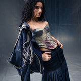 This corset top is crafted in the limited edition chatter print—with its moody blues, muted golds, and subtle blushes. A curved, structured neckline and a tailored fit. The back is equipped with a sturdy zip closure. Best paired with high-waisted trousers for a sharp, sophisticated look or a flowing skirt for a dramatic ensemble.