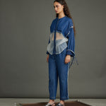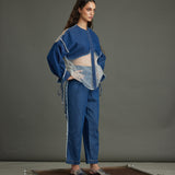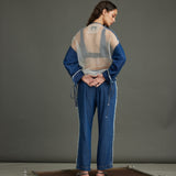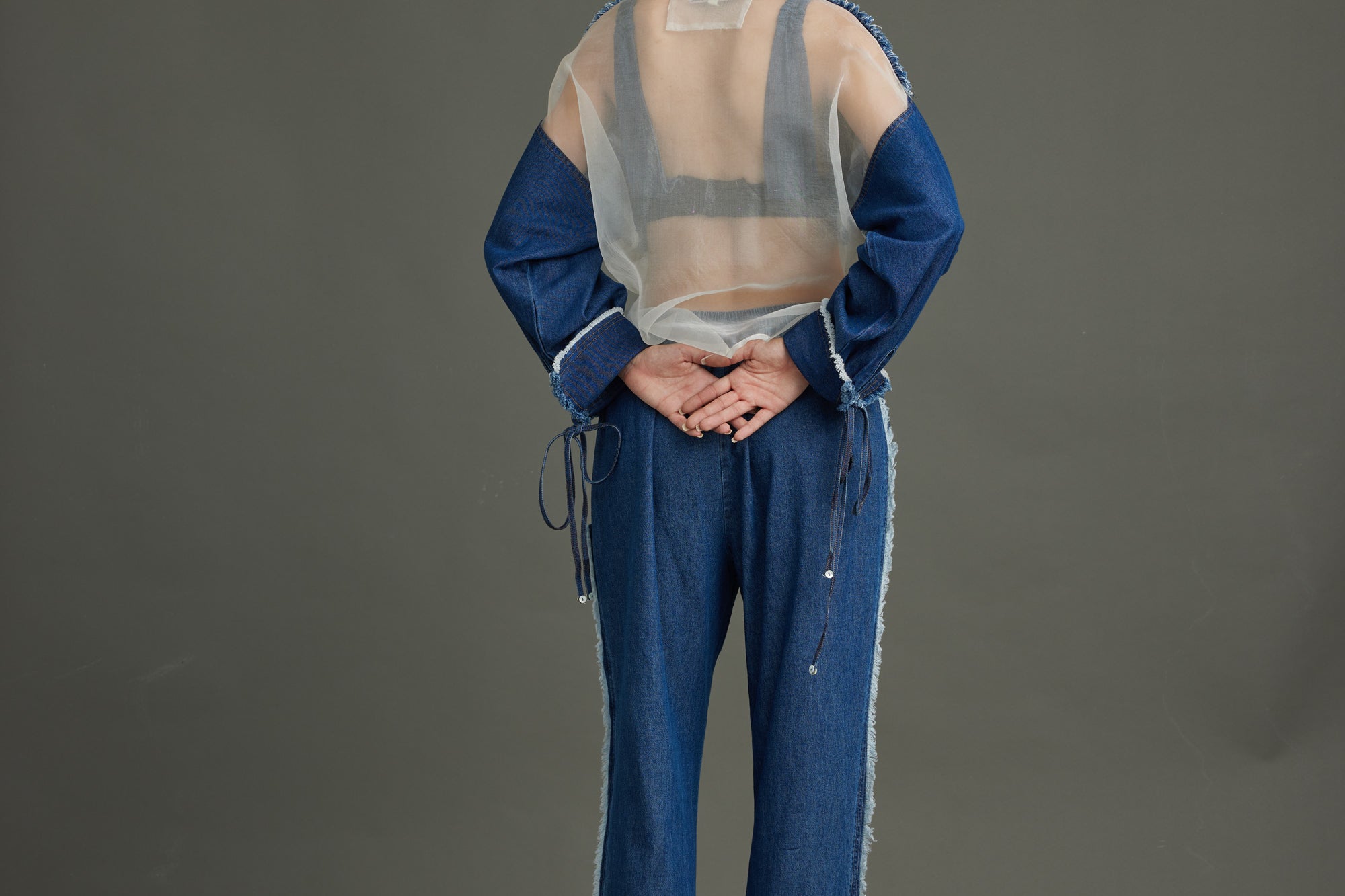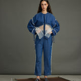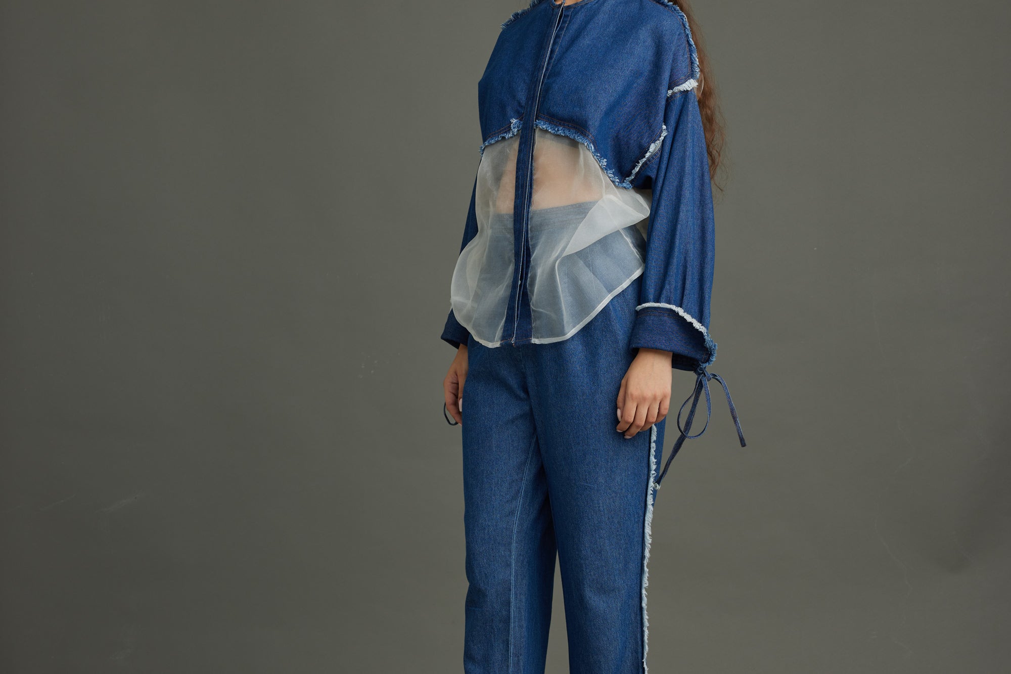 A denim and organza bomber jacket with tie-cuffed sleeves, an asymmetric river revealing a panel of sheer, structured mesh below the bust, echoed across both pieces with raw, exposed seam edges and contrast white stitching. The trousers maintain a relaxed, straight-leg fit, detailed with raw freys down the side.