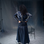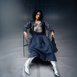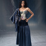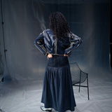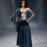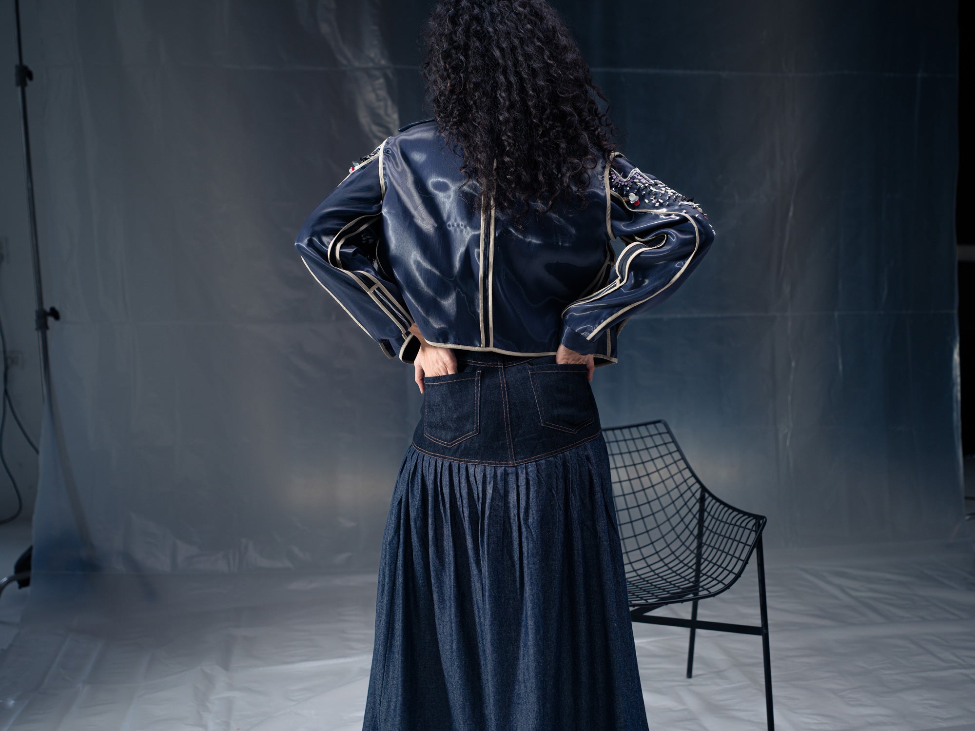 A flattering high waisted skirt. The structured yet stretch hip provides a tailored fit, while the generous pleats ensure comfortable movement and a sophisticated drape. Subtle contrast stitching and delicate embellishments are added along the hem. An ideal pairing for both day and evening wear.