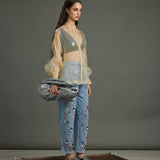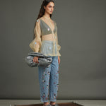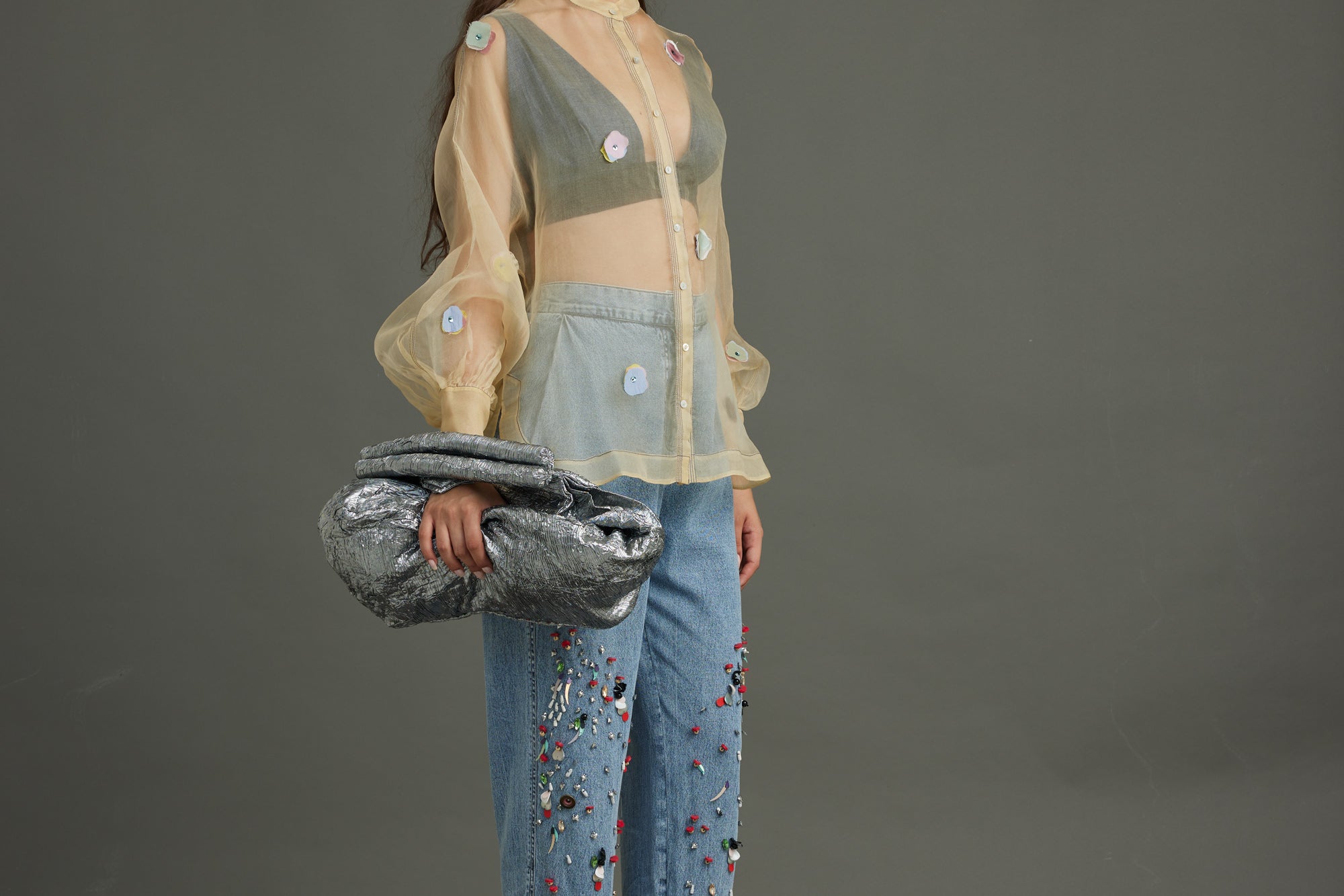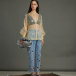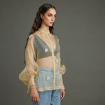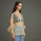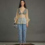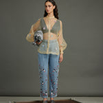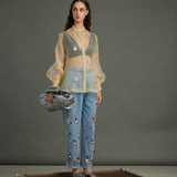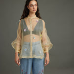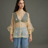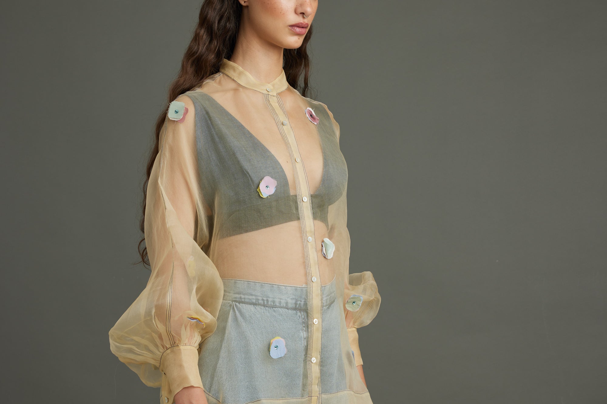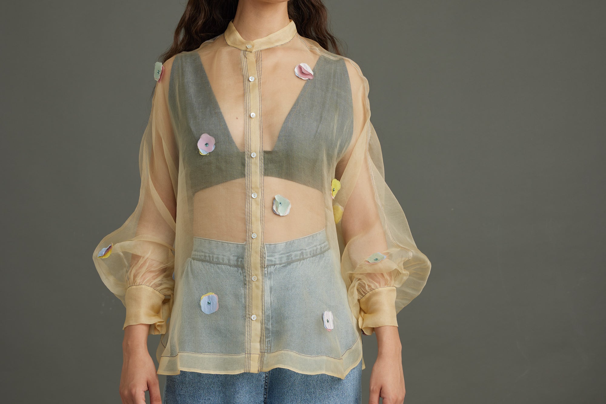 Hand embroidered layered flowers appliqued in varying textile of soft, contrasting hues, meticulously stitched to create a three-dimensional effect. A relaxed sheer shirt enhanced by bishop sleeves with buttoned cuffs.
