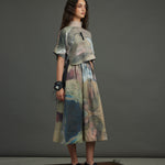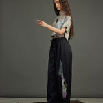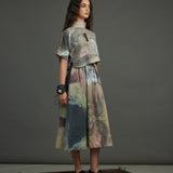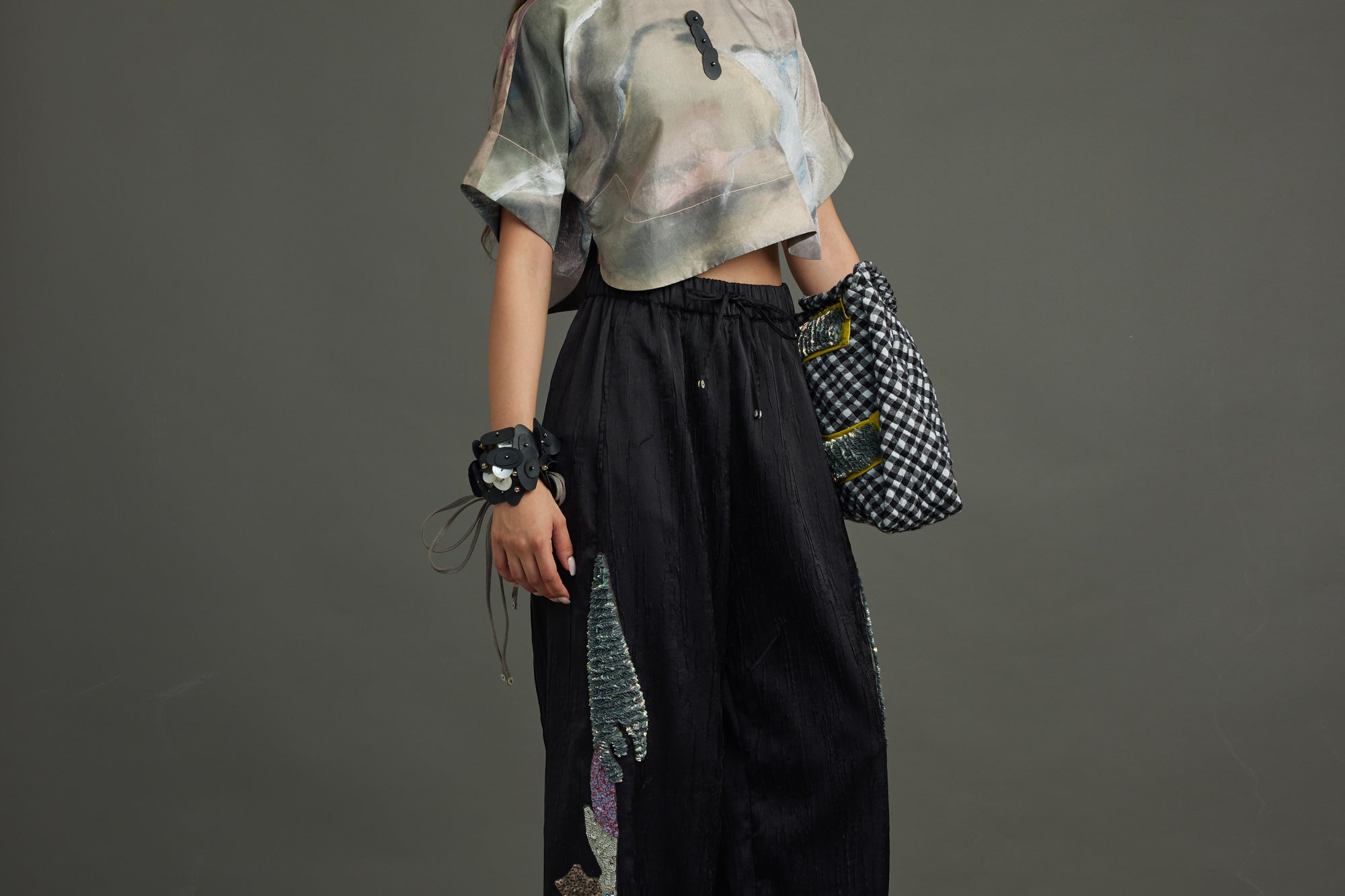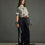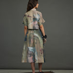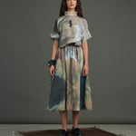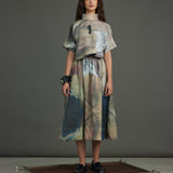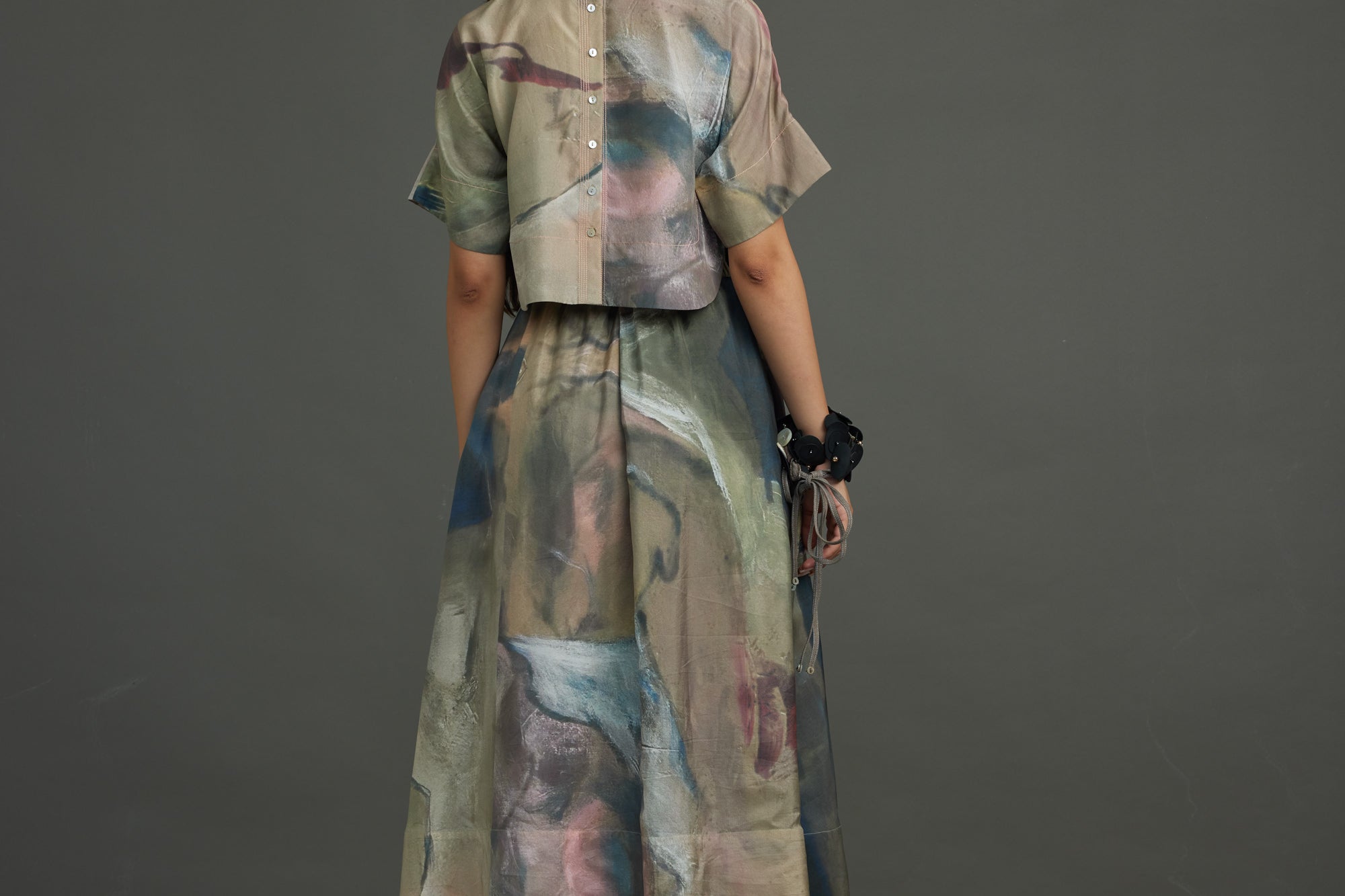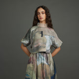 The silk crop top crafted in the chatter print - a rich, painterly brushwork of moody blues, muted golds, deep browns, and subtle blushes with rubber placed in a asymetric pattern at the heart of the piece, exaggerated with an organza collar, button down blouse at back.