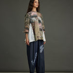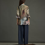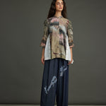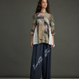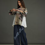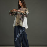 Chatter ear shirt finished with a stand collar and dramatic puff sleeves gathered into deep cuffs, the print features a rich, painterly brushwork of moody blues, muted golds, deep browns, and subtle blushes. Gathered silk panels are detailed with subtle mop buttons and introduce a flared movement to the hemline.