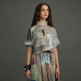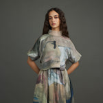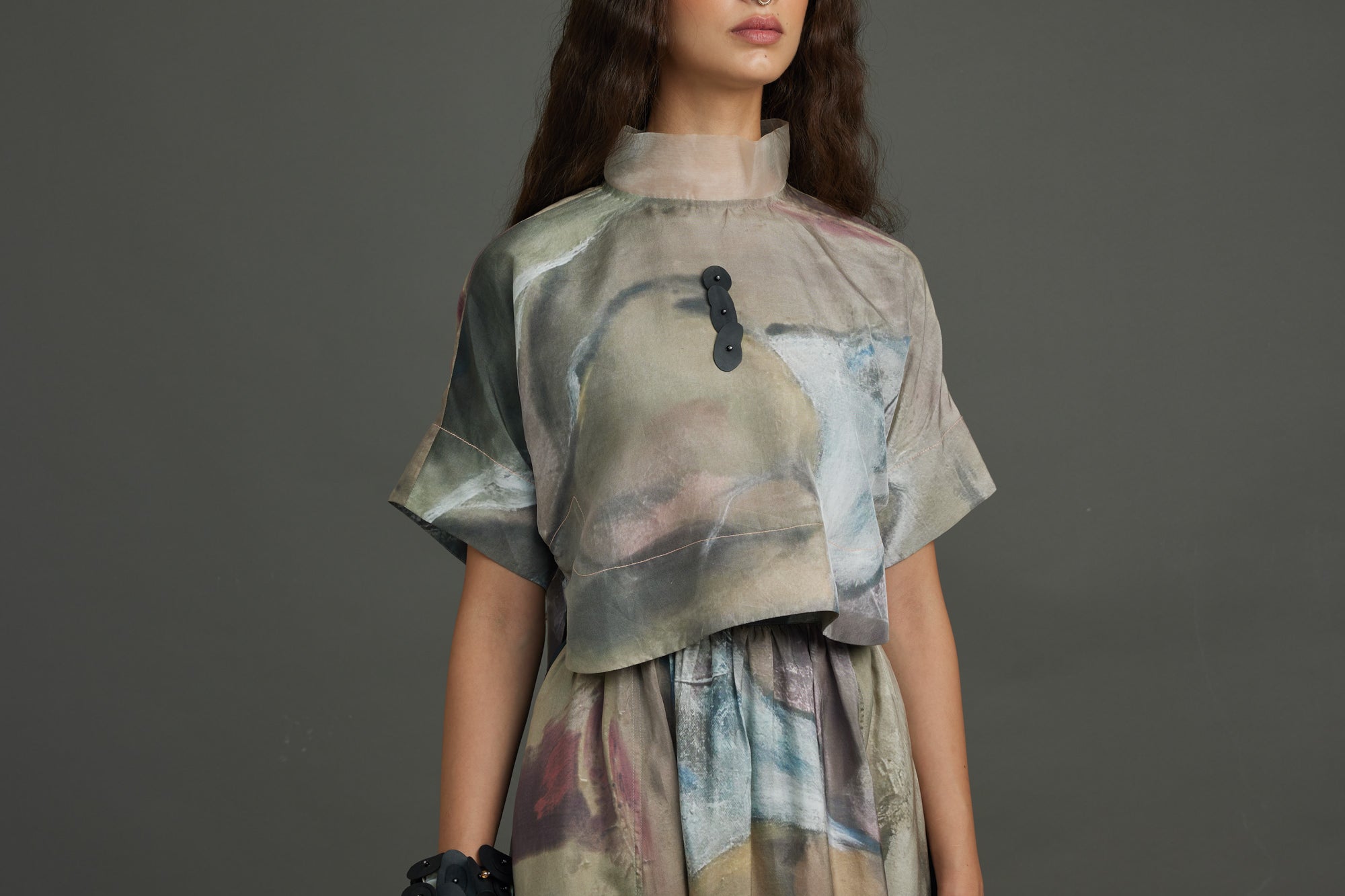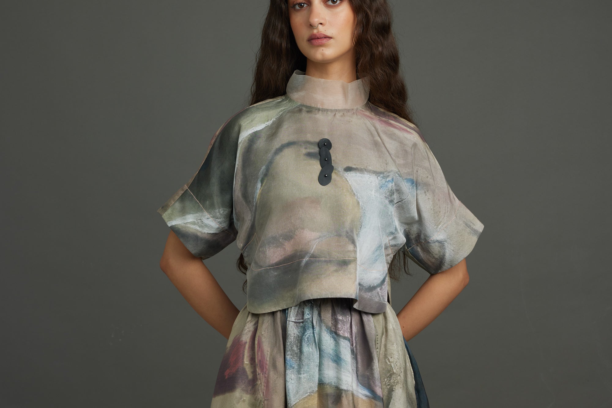 GRAINE's wearable art. Named for the dynamic interplay of its shades, the print features a rich, painterly brushwork of moody blues, muted golds, deep browns, and subtle blushes. The print's abstract nature is designed to be celebrated for its individuality. The A-line silhouette offers a comfortable fit, while the smooth silk textile provides a smooth sheen.
