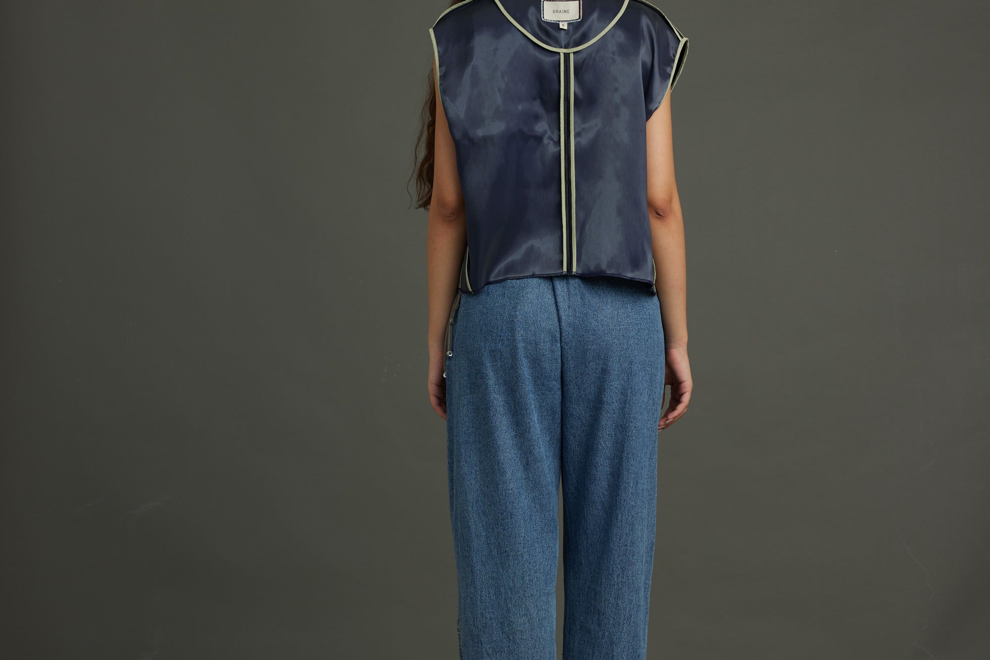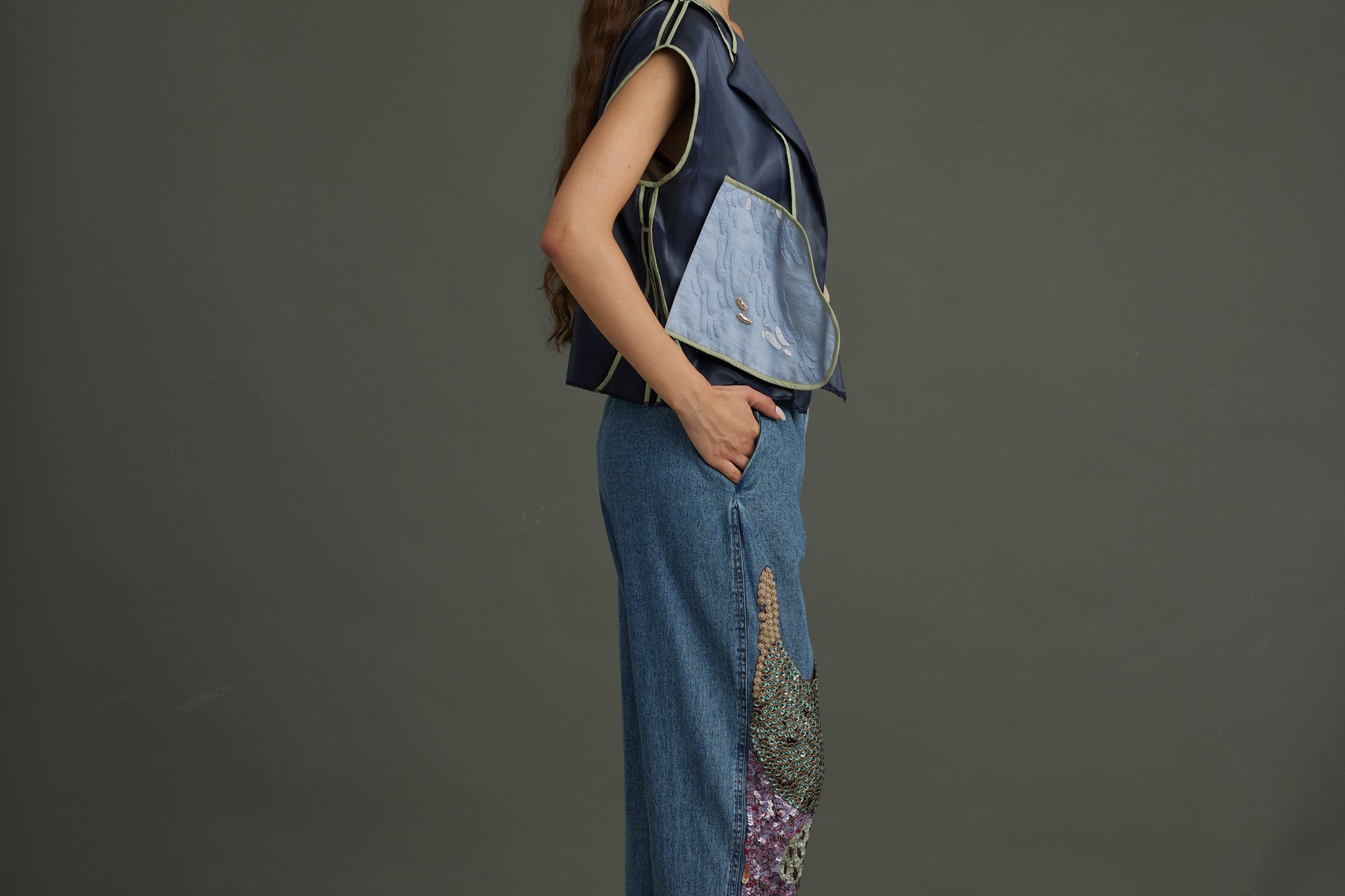 Remaining classic outerwear with a contemporary edge. Crafted from metalic liquid fabric with a subtle satin finish on one side. Mousse color piping meticulously outlines every seam. A striking chikankari pocket rooted in GRAINE signature work. A fusion of fluidity and structure.