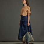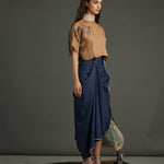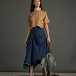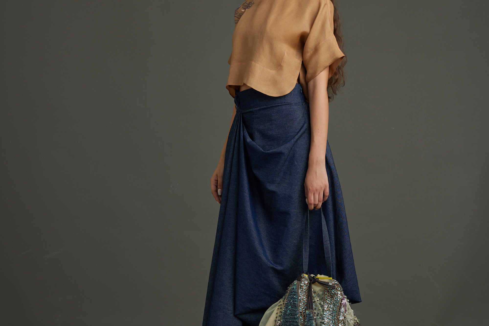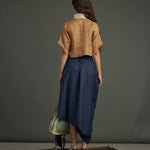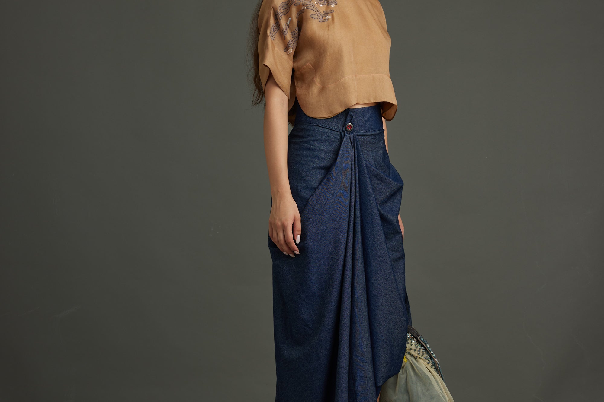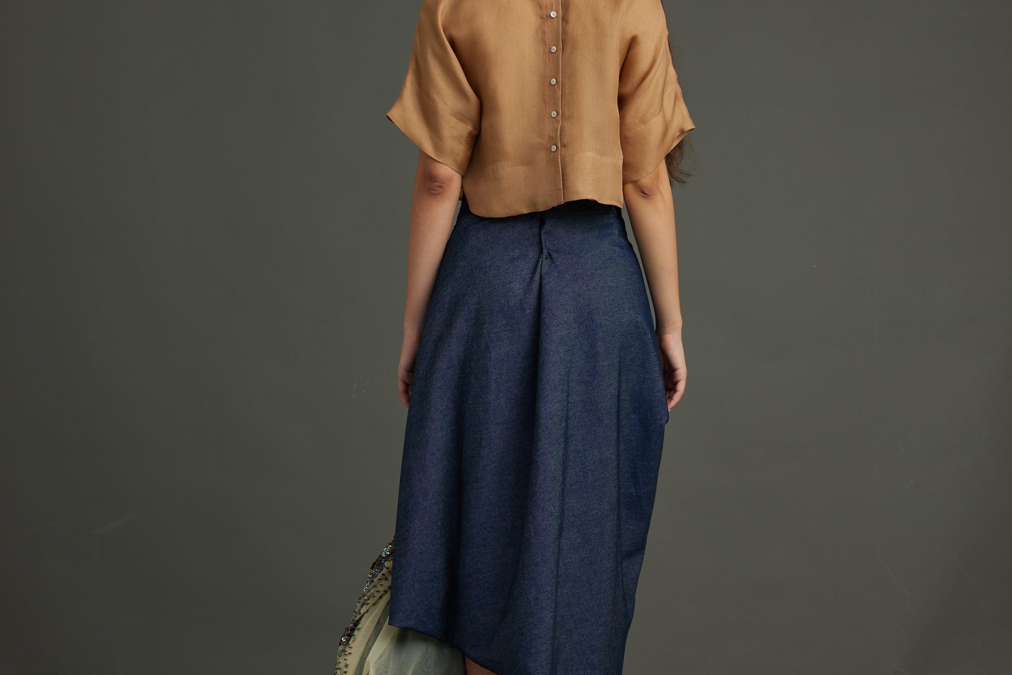 Set in as an overlayer crop top in translucent and fire in soft ocre, 100% silk natural tone 2x4 organza perfectly complemented by a soft Crepe lining for luxurious comfort and opacity., the heap blouse carries the signature graine chikankari and badla work motifs.