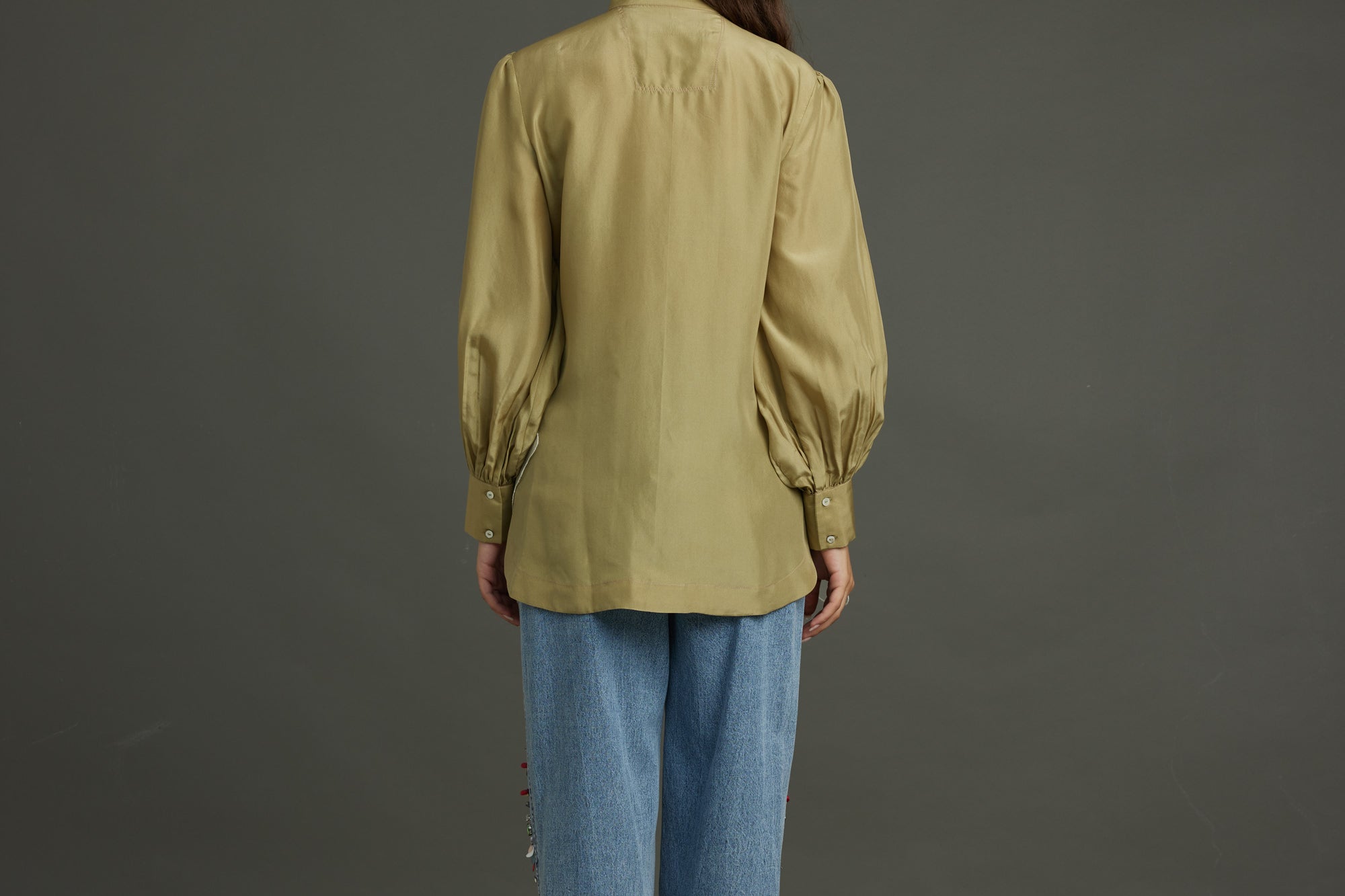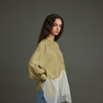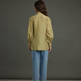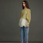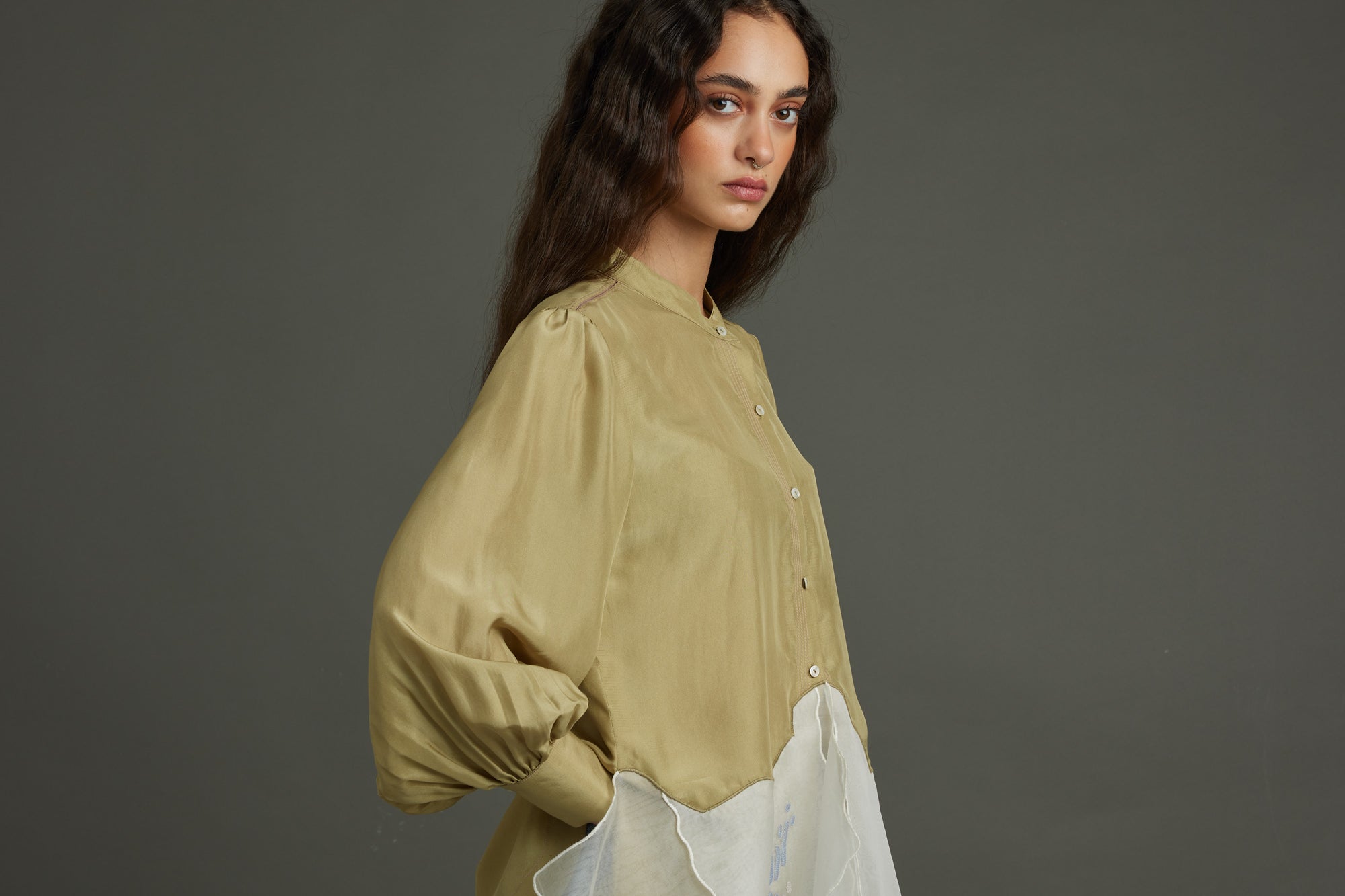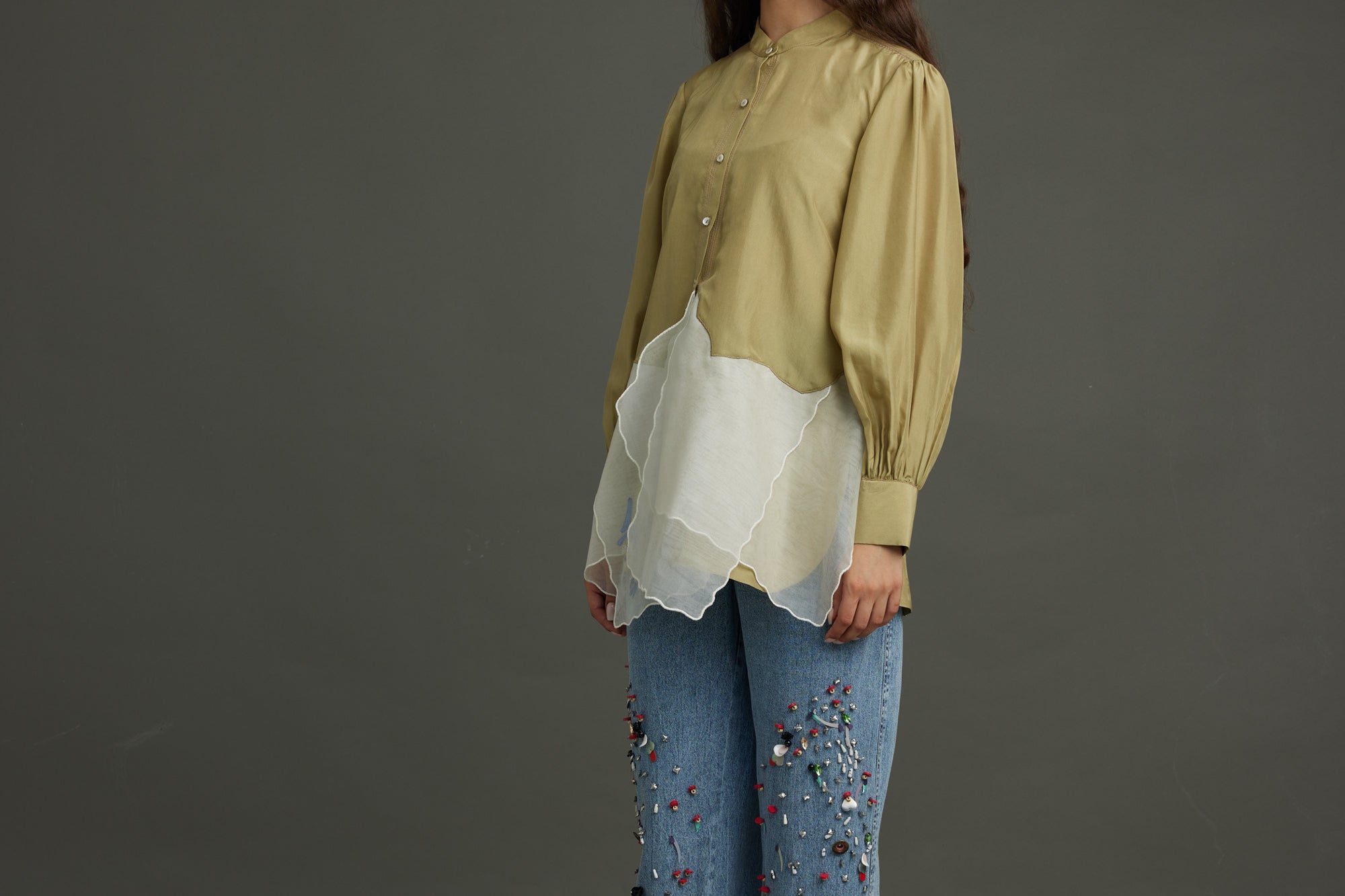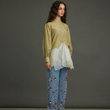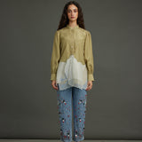 The GRAINE river pattern continues to the chikankari shirt in the refereshing dill colour. Fluid organza panels are intricately attached with detailed embroidery, creating an asymmetrical layered hem. Adorned with intricate Chikankari and Mukaish work, abiding by GRAINEs signature of traditional craftsmanship to the modern design.