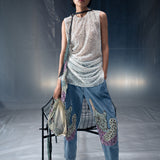A striking blend of art and rugged utility, these sandblast washed denim pants are an eclectic statement. The classic blue denim is reimagined with a contemporary, anti-fit silhouette that features a "double spill" embellishment.