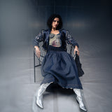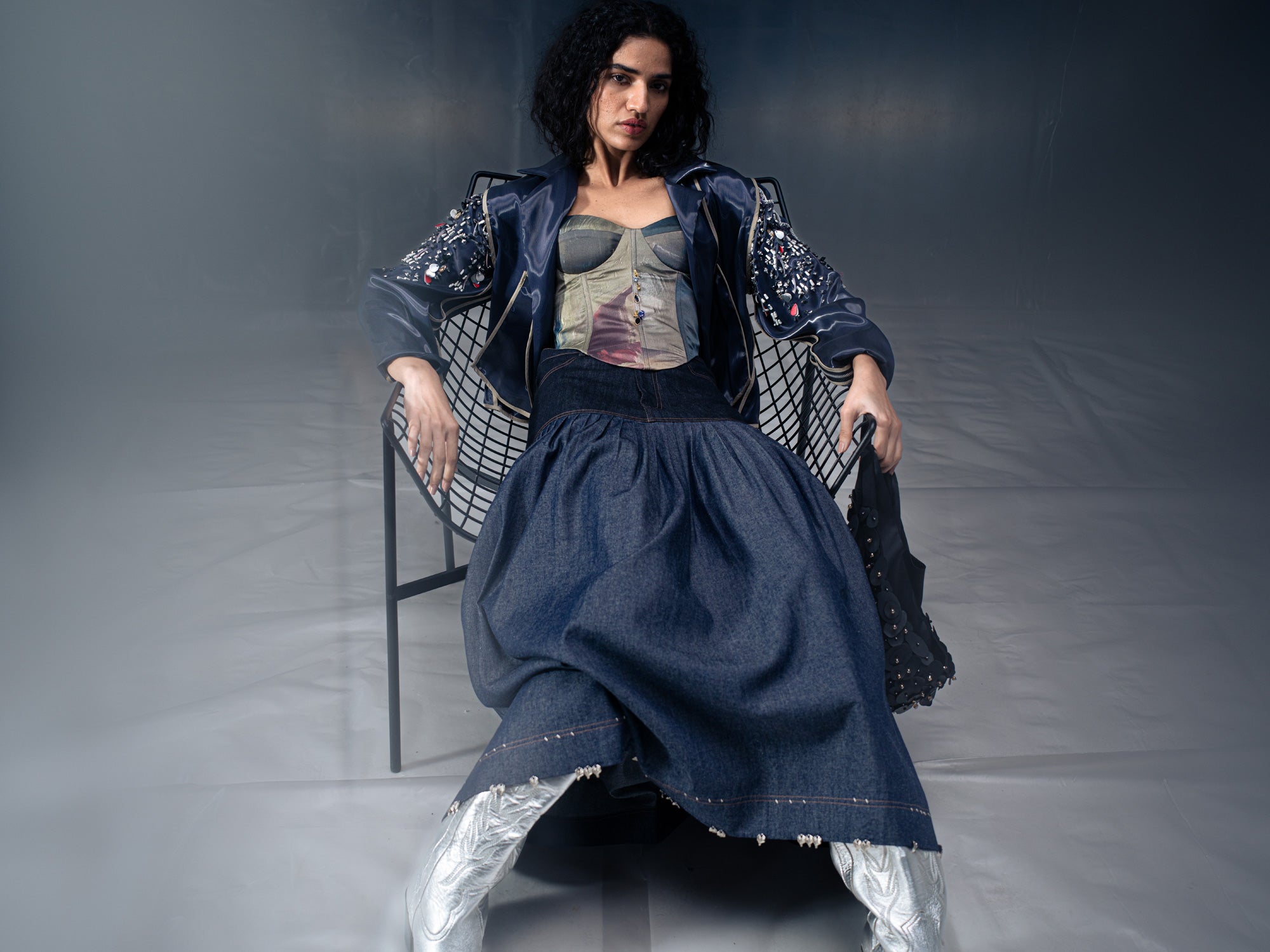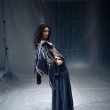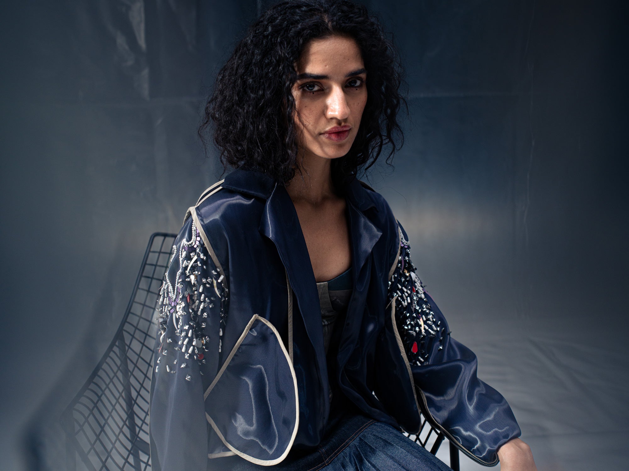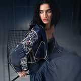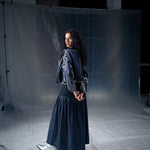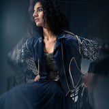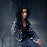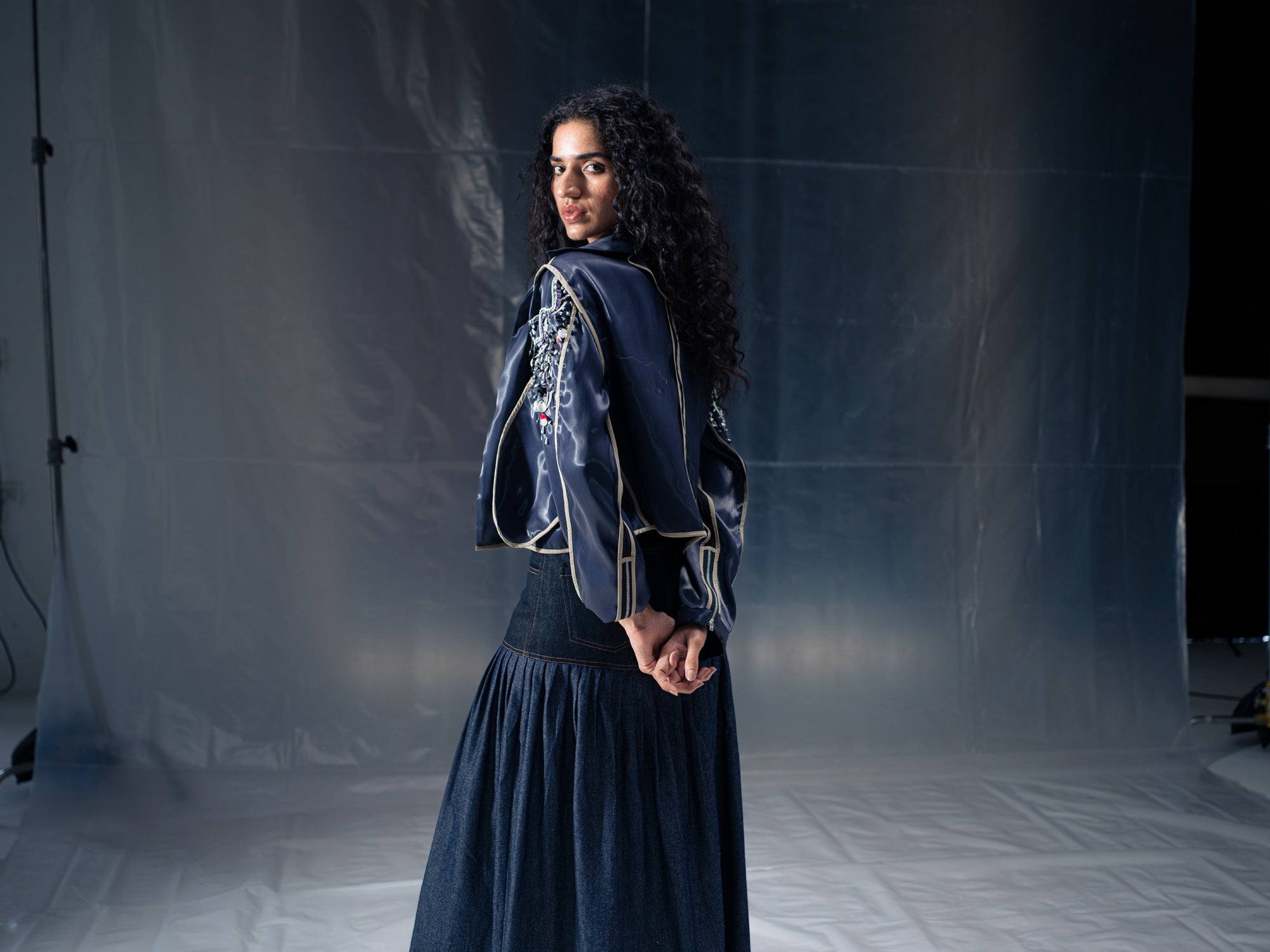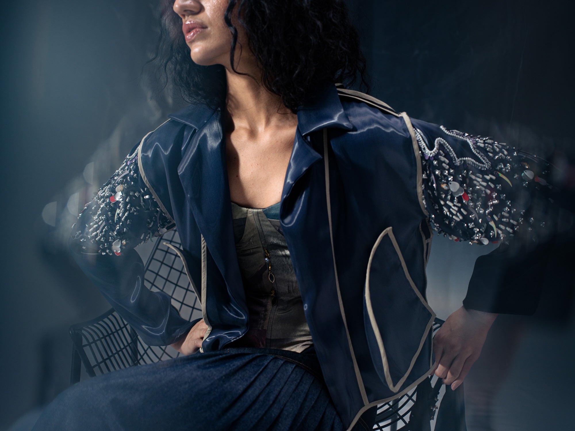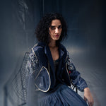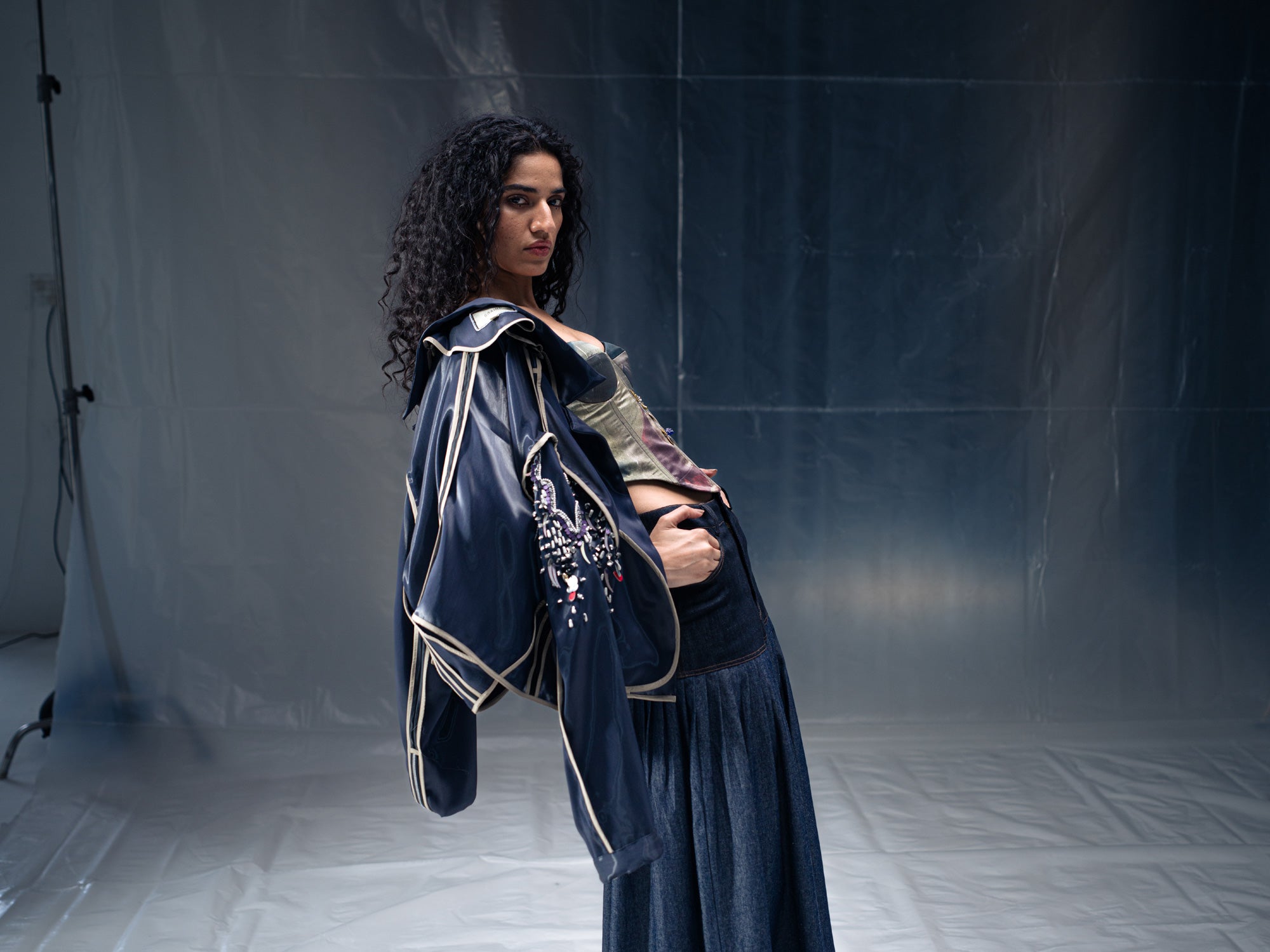the double wet jacket reimagines classic outerwear. The liquid blue adorns a subtle satin finish. contrast color piping meticulously outlines every seam. The sleeves are adorned with intricate metal work, adding a fusion of fluidity and structure.