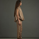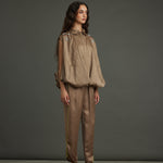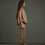 Designed for all-day or evening comfort, the trousers feature a subtle shirred, elasticized waistband at the back, maintaining a clean, flat look across the front. The fit is relaxed and straight-leg, ensuring a flattering drape. The defining detail is the striking Dill piping, which cleanly traces the entire side seam down to the hem. This bright, contrasting line adds a