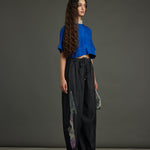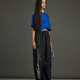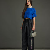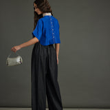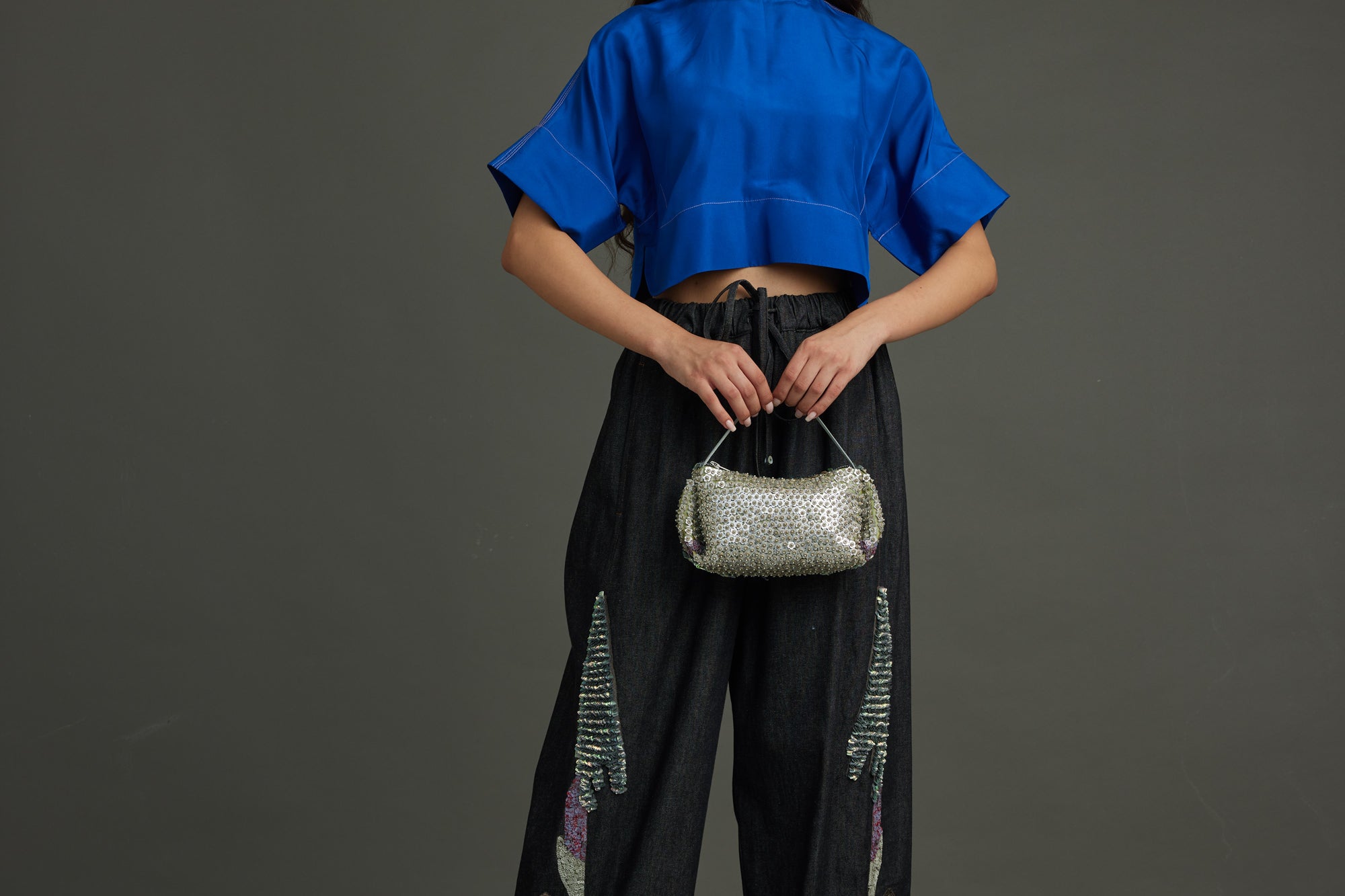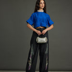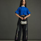 The silk crop top made in vibrant shade of electric blue with a crisp, high collar frames the neck, while the wide, kimono-style short sleeves lend an effortless, relaxed drape. button down blouse at back.