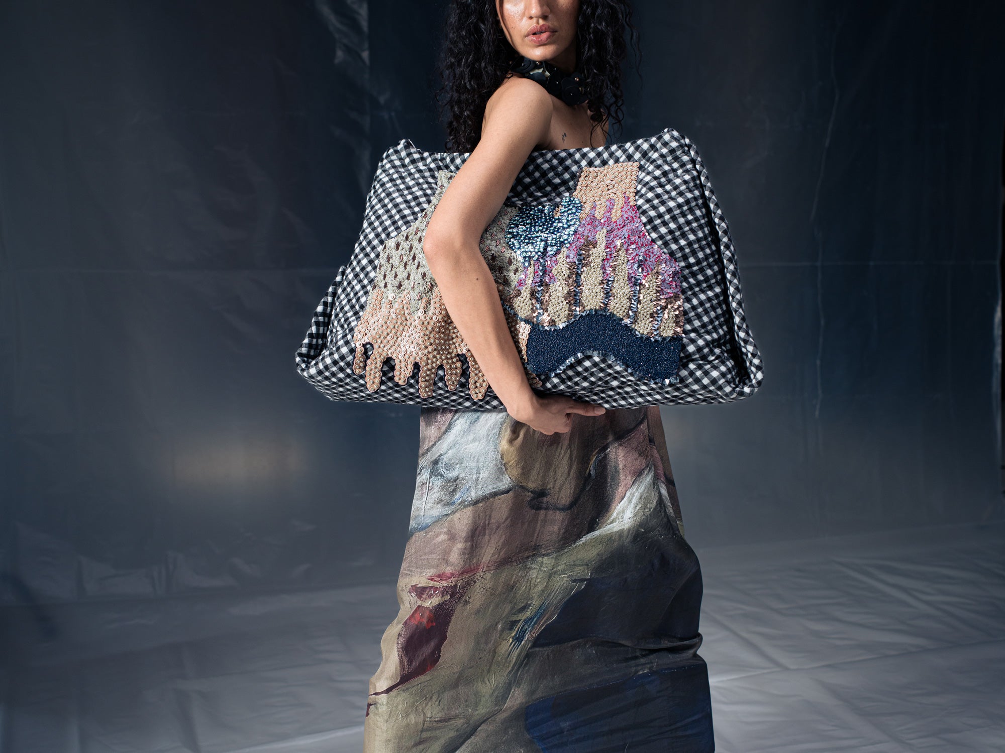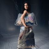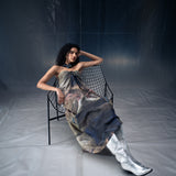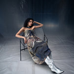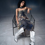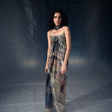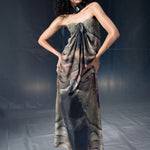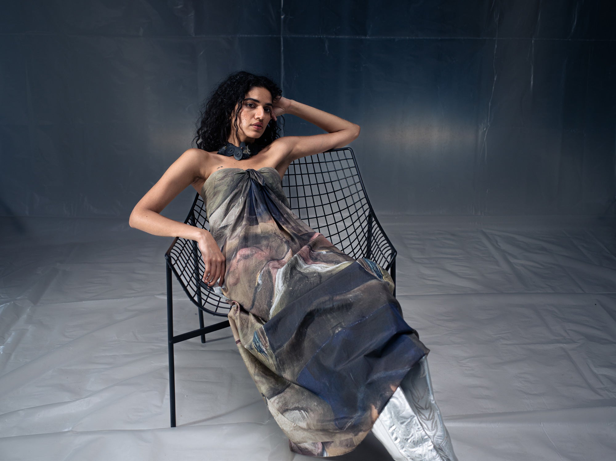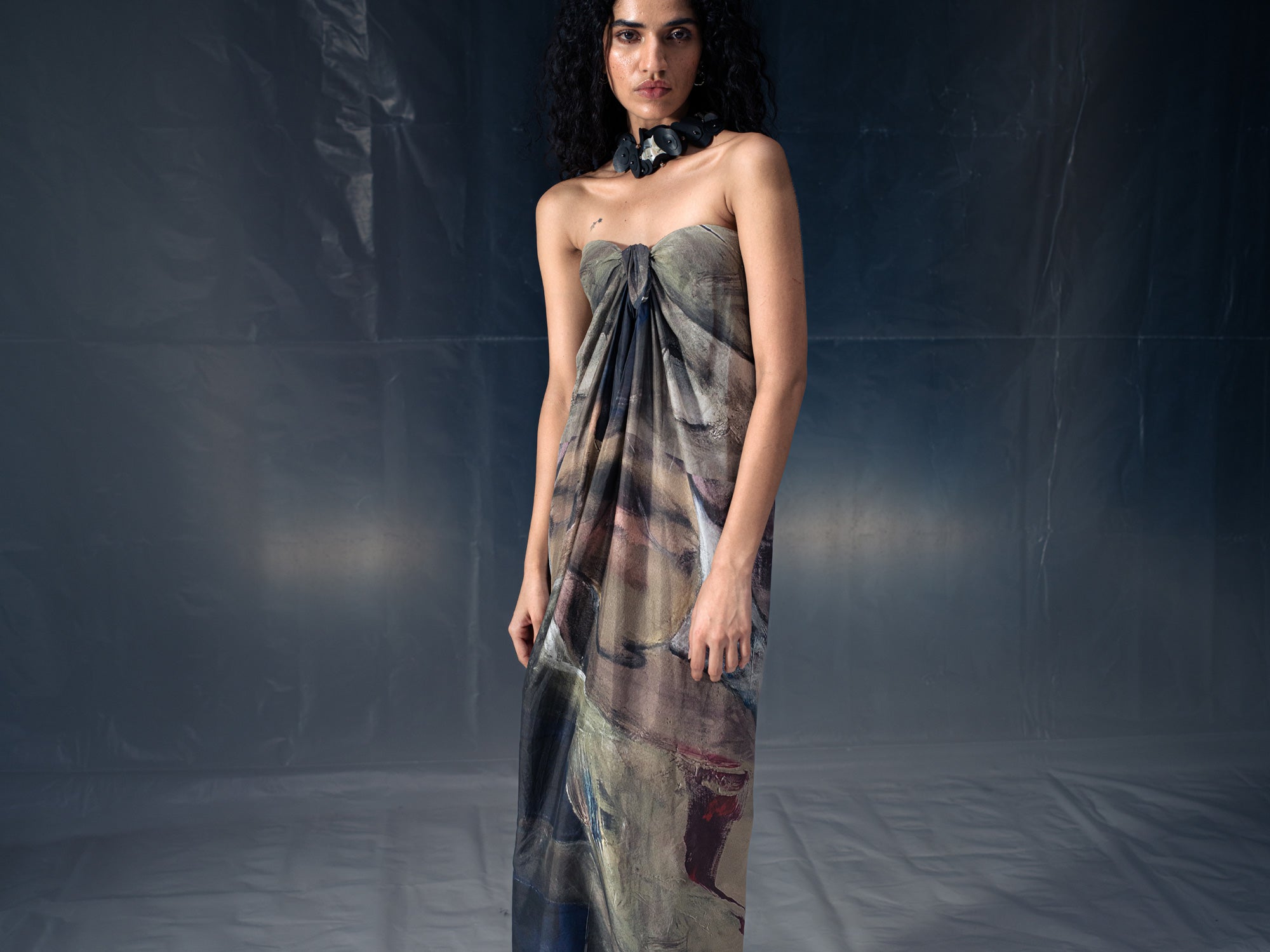 GRAINE art makes way to clothing, The strapless silhouette features a beautifully draped and gathered bodice, allowing the chatter print—with its moody blues, muted golds, and subtle blushes—to flow and narrate.