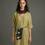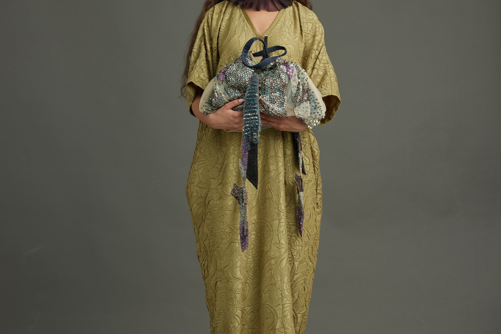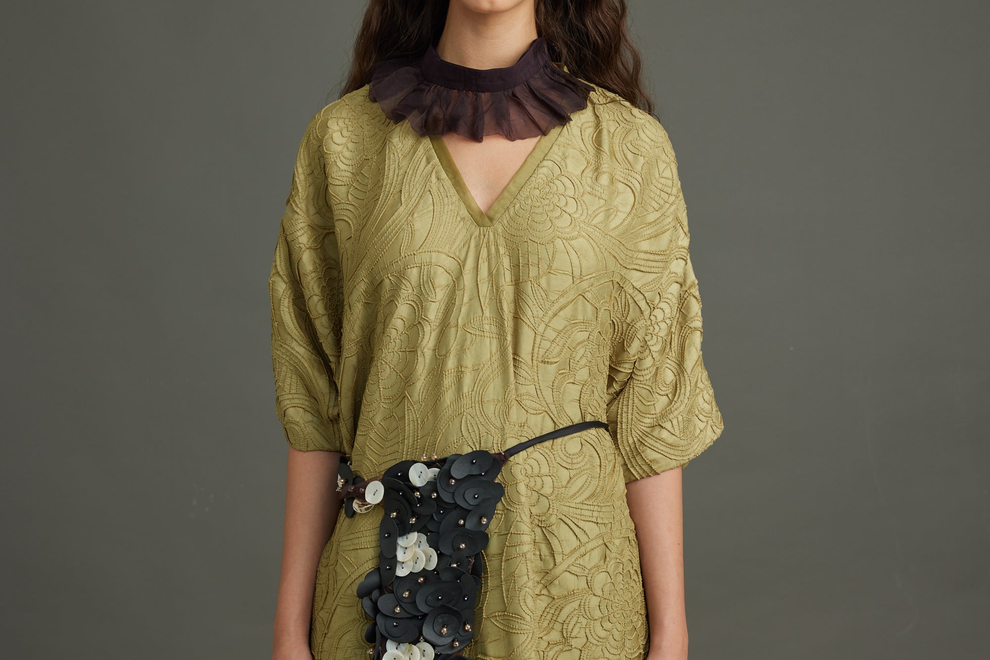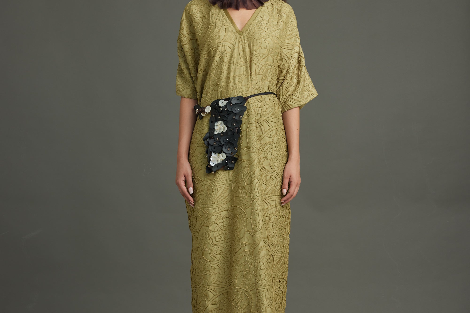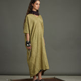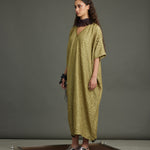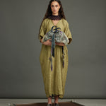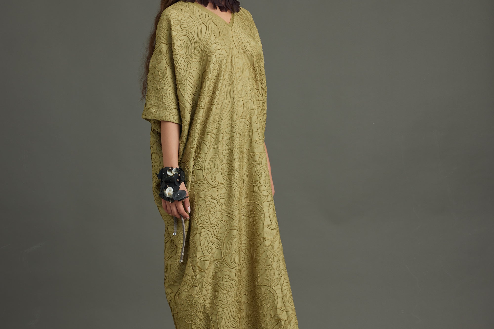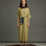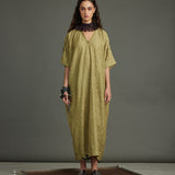 The Infinity Kaftan crafted in texture silk in a distinct dill color. Embellished with graine metal buttons.