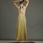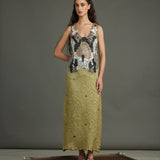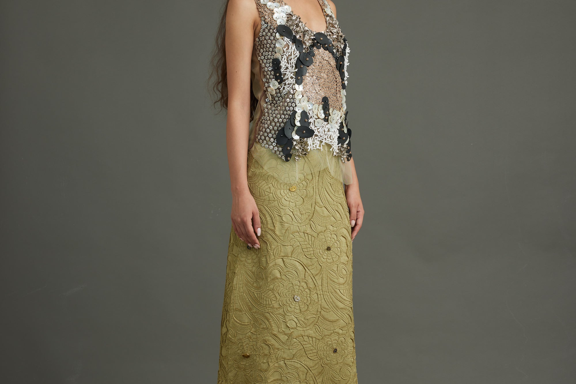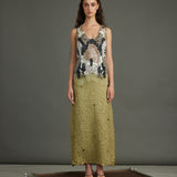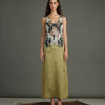 Bias cut ankle length skirt in a sleek, straight silhouette and a raw, deconstructed hemline. A dimensional silk texture and GRAINE metal buttons highlight the dill hued skirt.