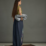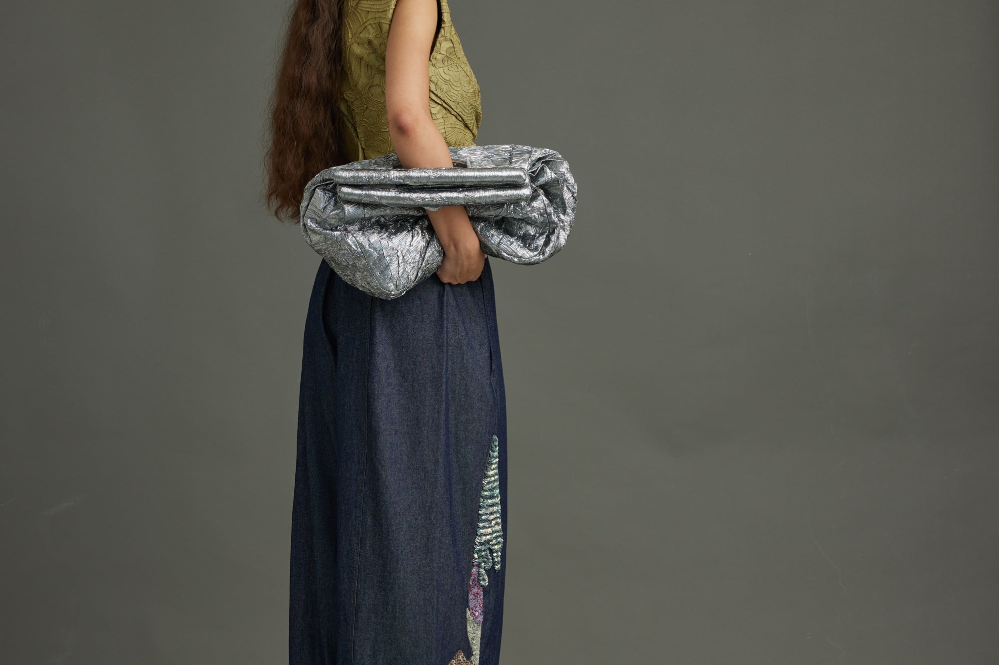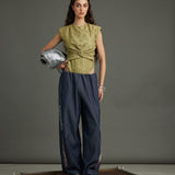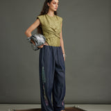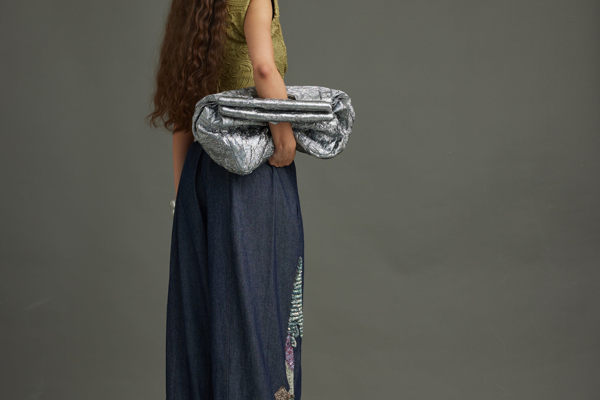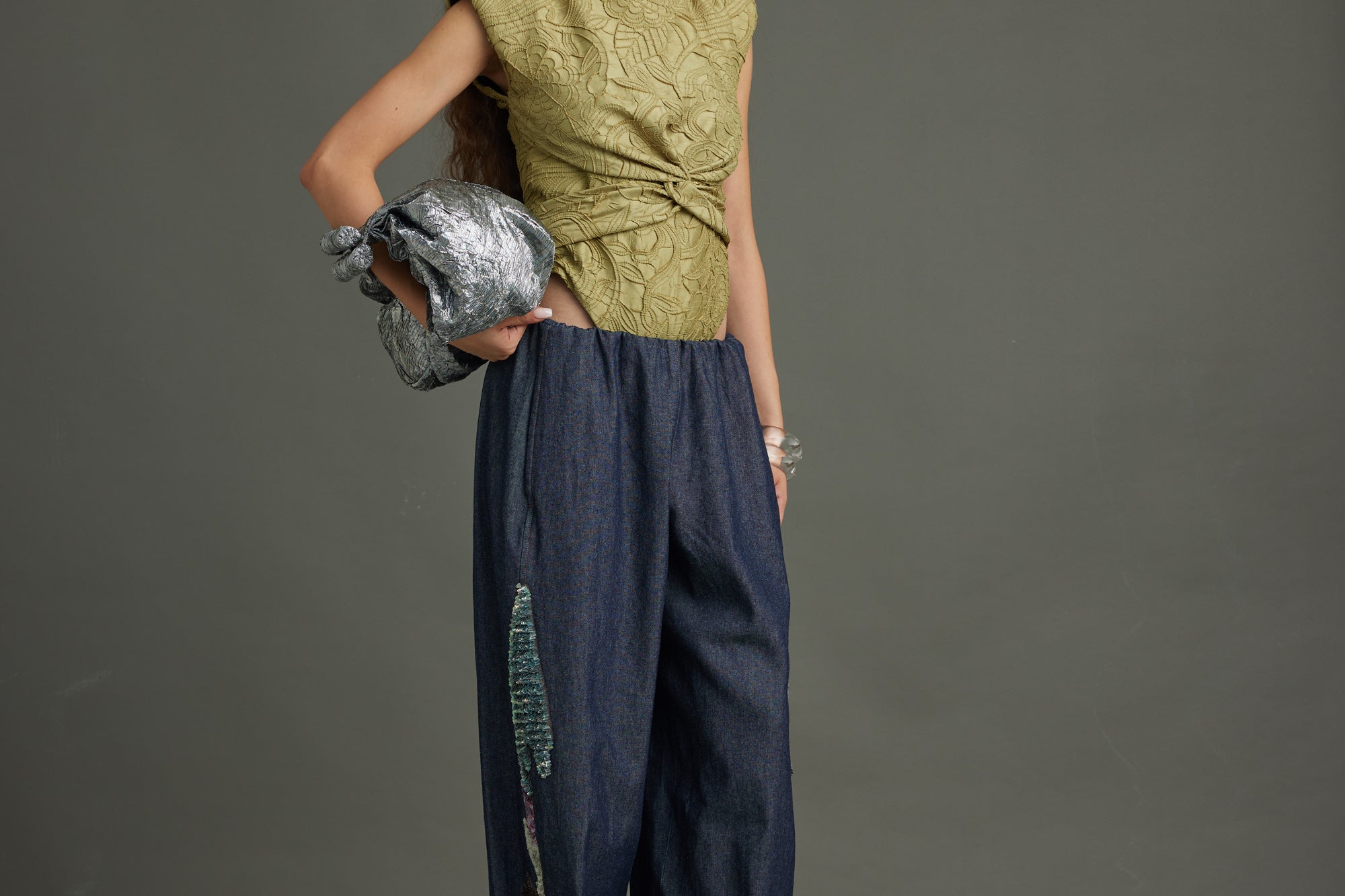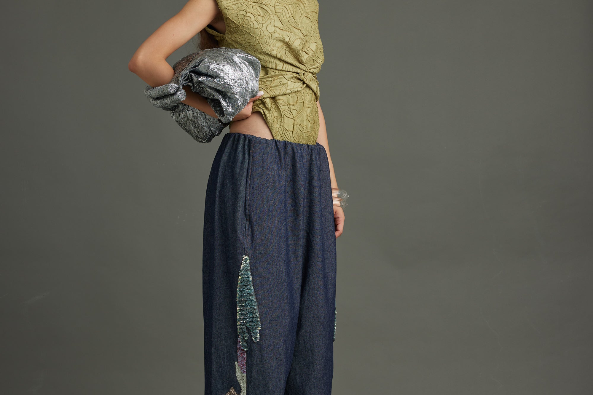These denims exaggerated in the Farshi-style feature the prism lightening artwork in the front panels. The elasticated waistband with drawstring provides a relaxed, adjustable fit. Princess seams on the front and back create a beautifully draped Farshi silhouette.