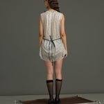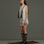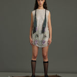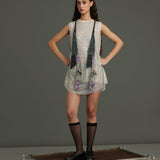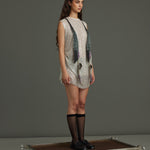 A sleeveless shift dress with a luminous, all-over finish of sequin, transformed by mixing denimt textile straps that fall from the shoulder with lightning artwork. Fabric gathered on side seam and a drawstring added at the back to hold the gathered look.
