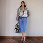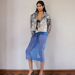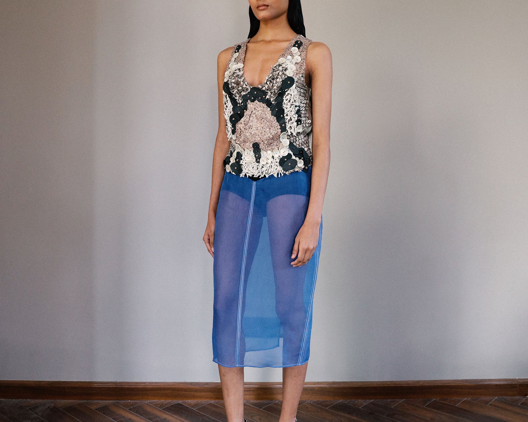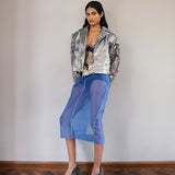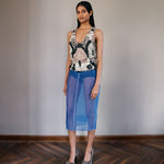 The electric blue colour defining the spirit of GRAINE find, stitches running over the garment creating a linear pattern, with a knit V-curved waistband for a comfortable and secure fit sitting comfortably on the waist.