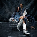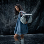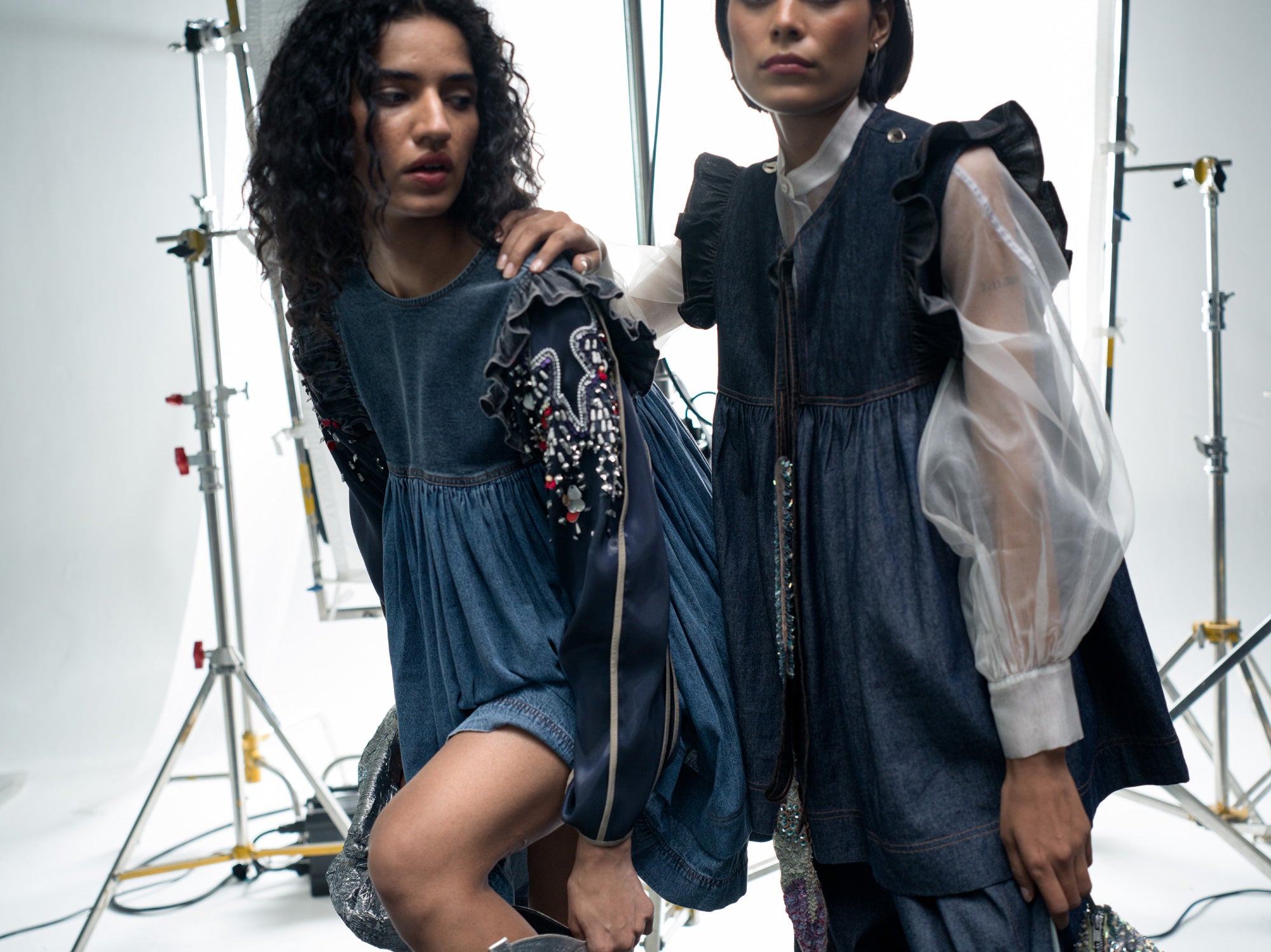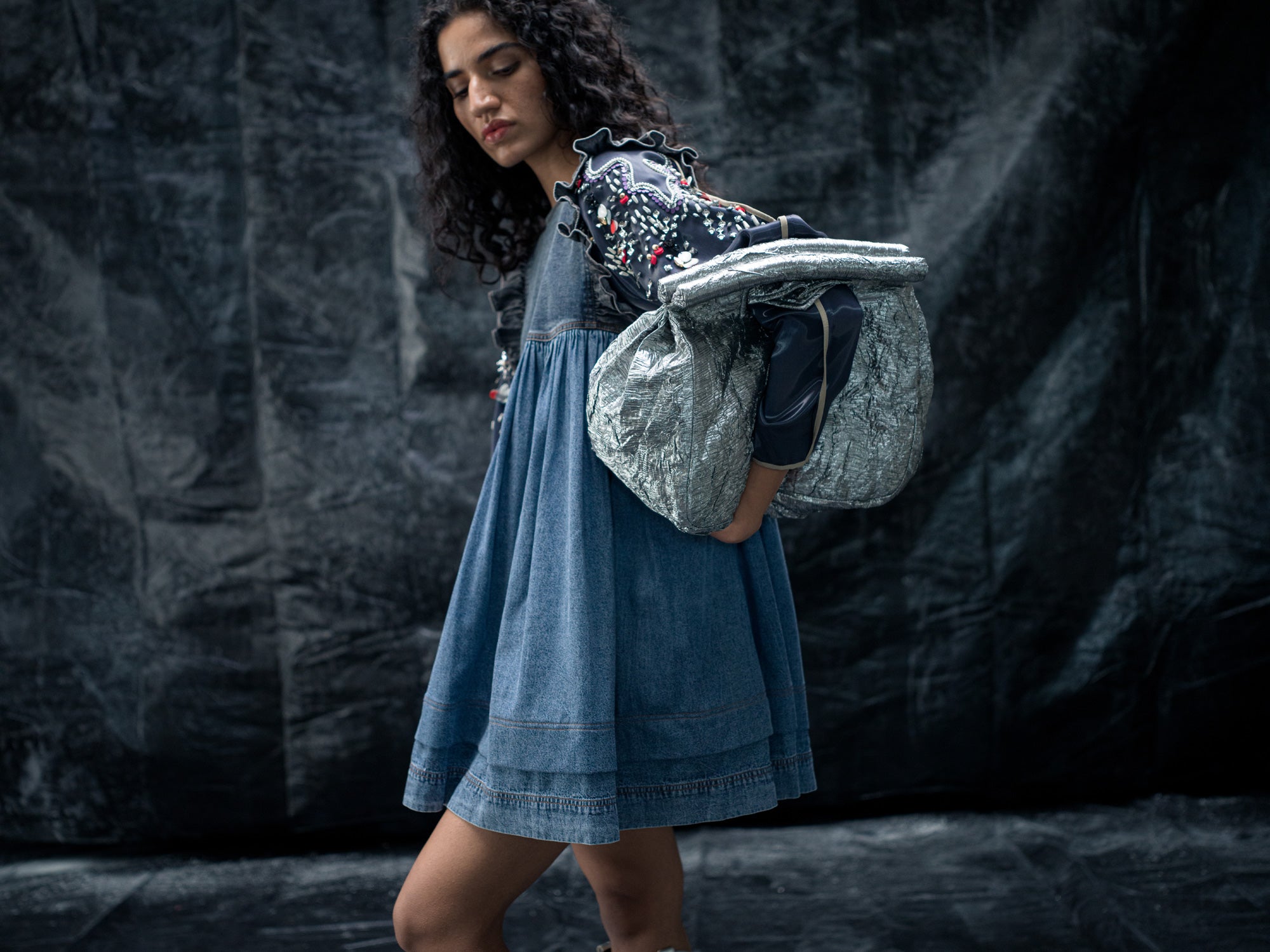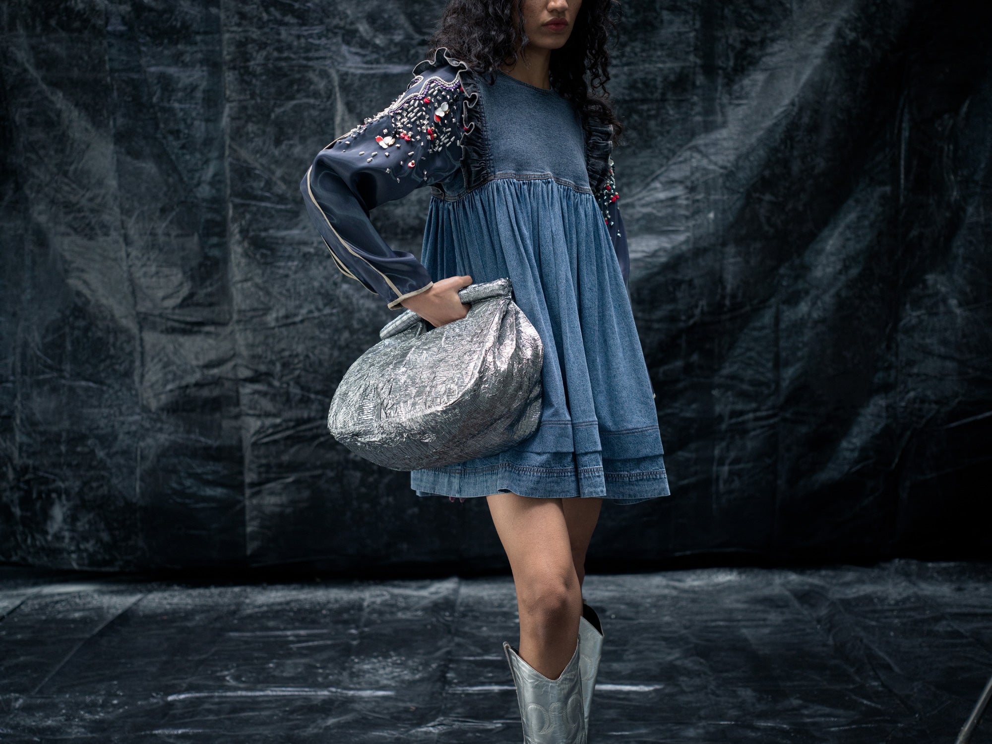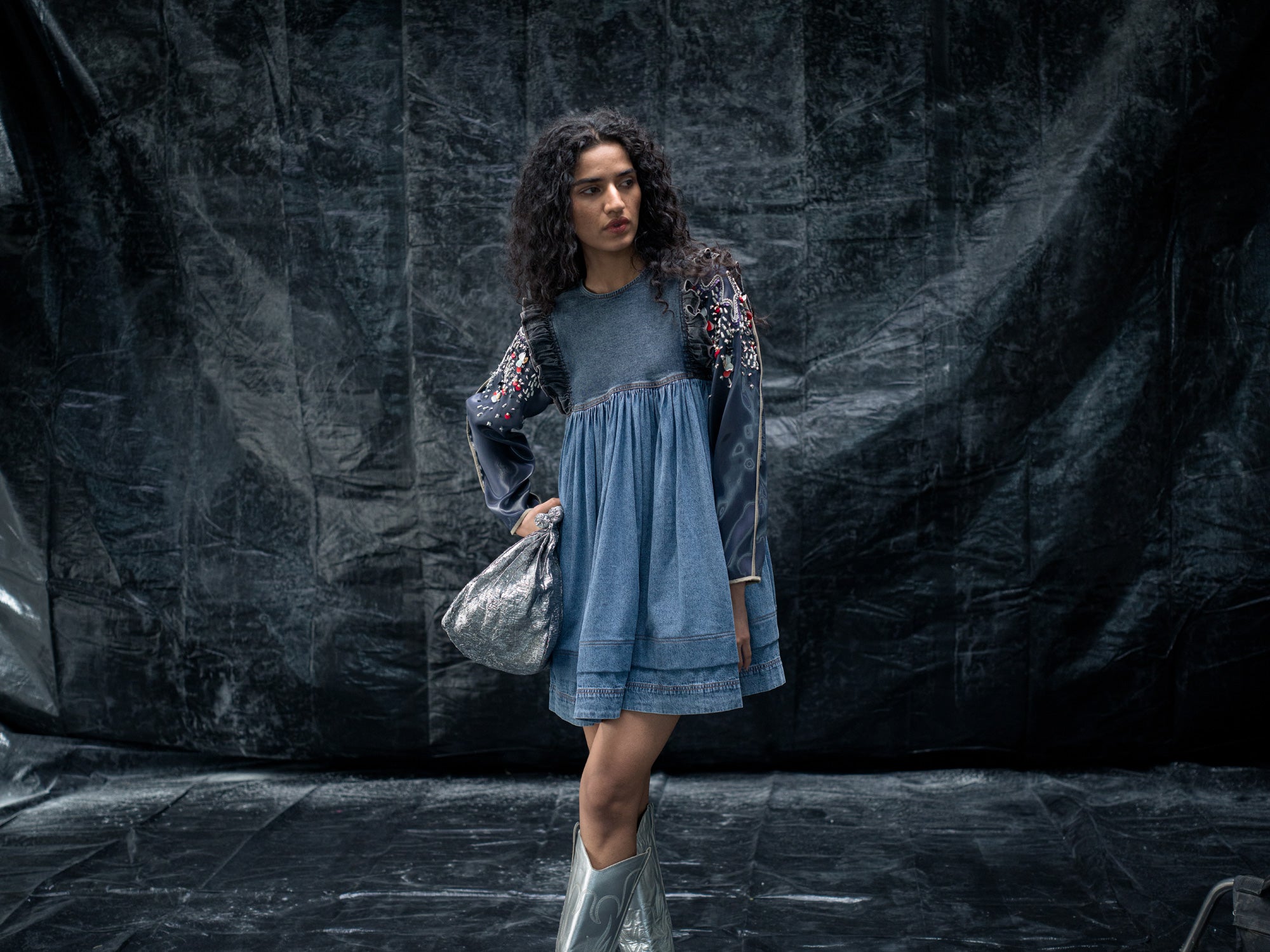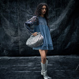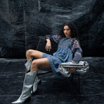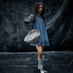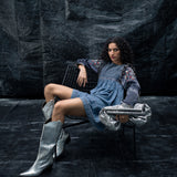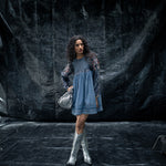A sandblast wash-denim dress, with curved cap on the sleeves, detailed metal work on liquid and a gathered empire waist crafts the Liquid soar dress, the back detail higlights in an asyemmetric denim tie.