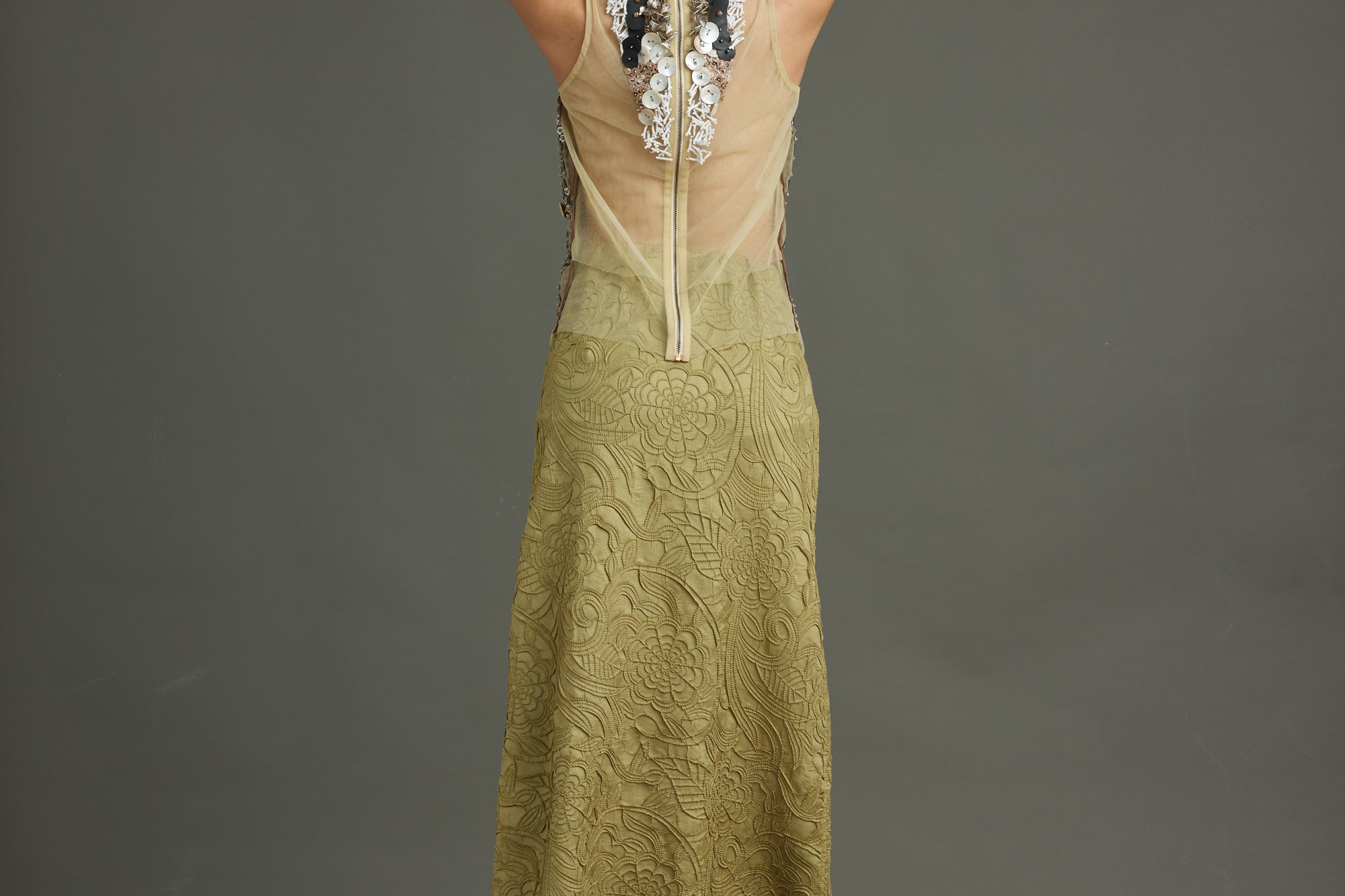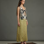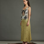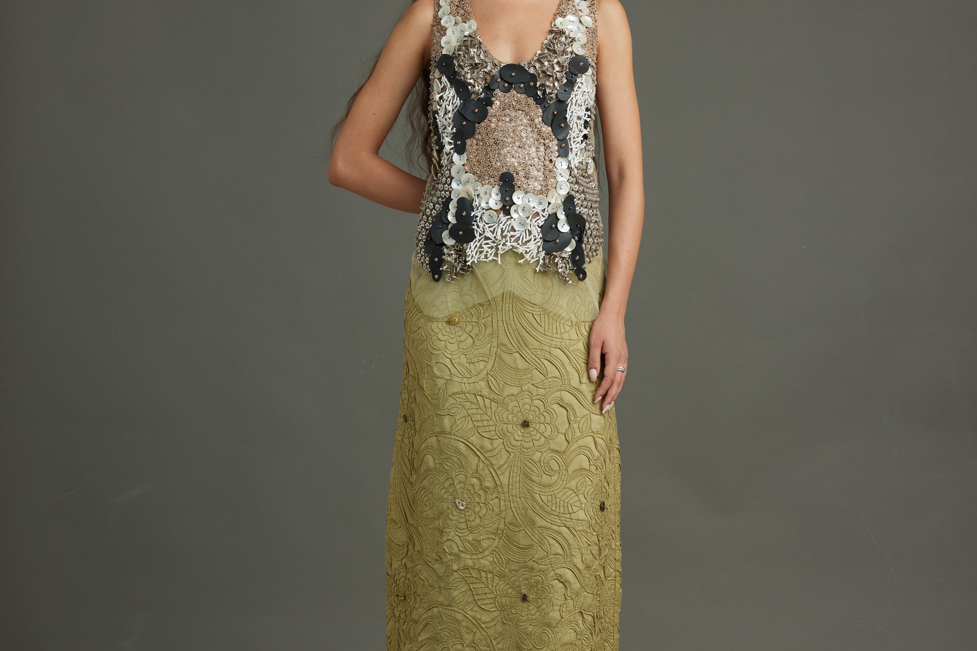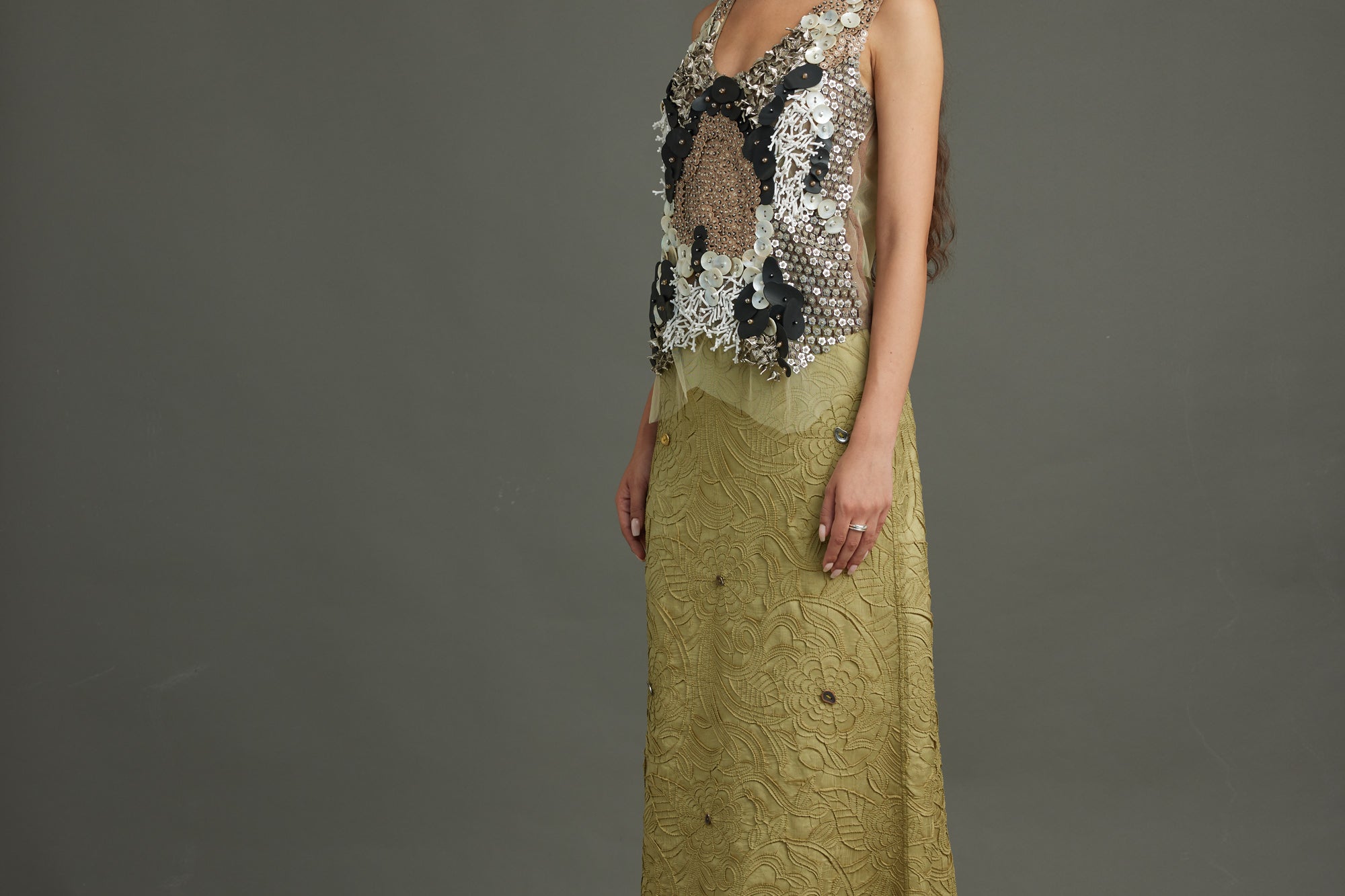 Classic summer tank look with signature GRAINE rubber detailing providing interplay of textures. The timeless button detailing clustered to mold in stone skin net structure. Pairable with a skirt, a saree or layered with a jacket.
