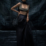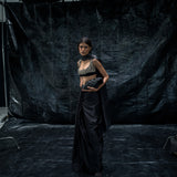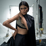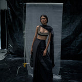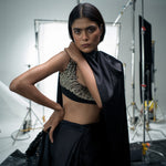 The bralette top is hand crafted with small, shiny metal leaf details. Its structured shape and dimensional texture make it perfect as a blouse or a layering essential.