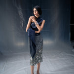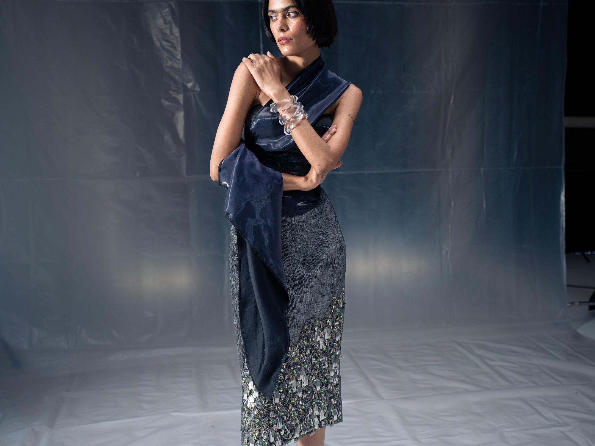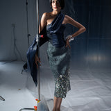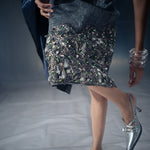 A pencil fit skirt in GRAINE Signature koin textile. Hand embelished metal artwork along with asymmetrical pattern of silver and green crystals, add to an eclectic edgy apperance.