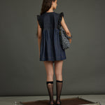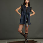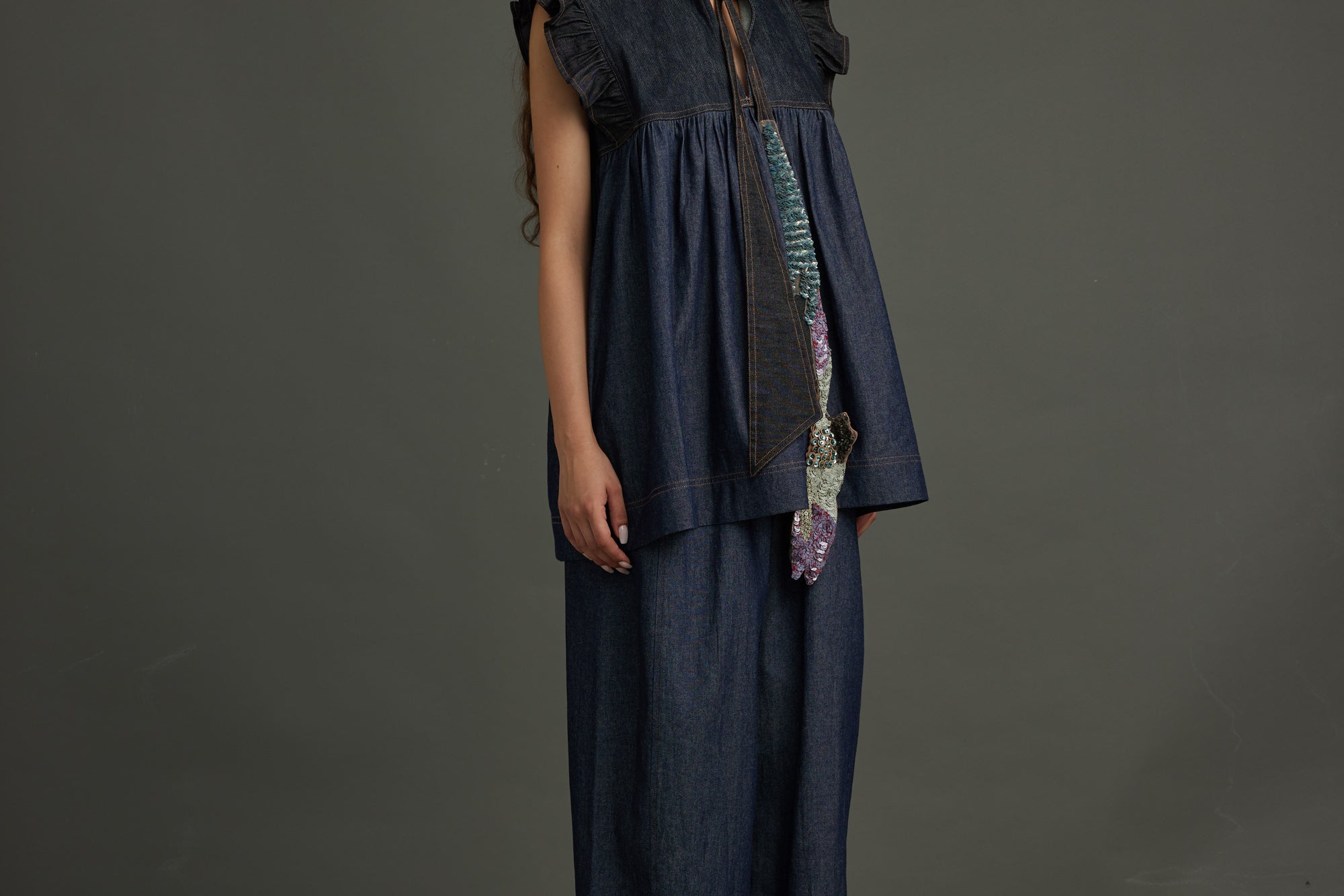 A dark wash-denim in a flare silhouette crafts the midnight top, with curved cap sleeves and a gathered empire waist, Intricate prism artwork higlights the front detail in an asyemmetric denim tie.