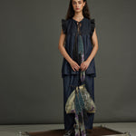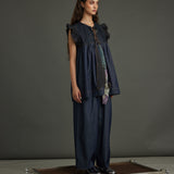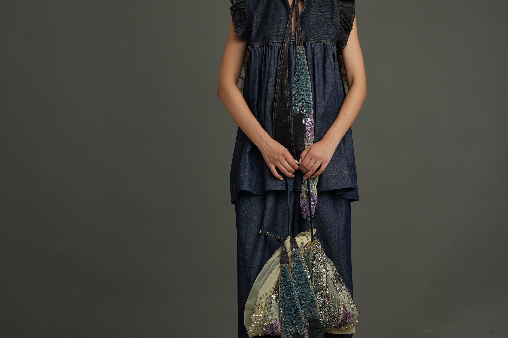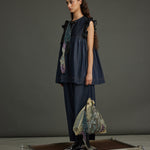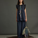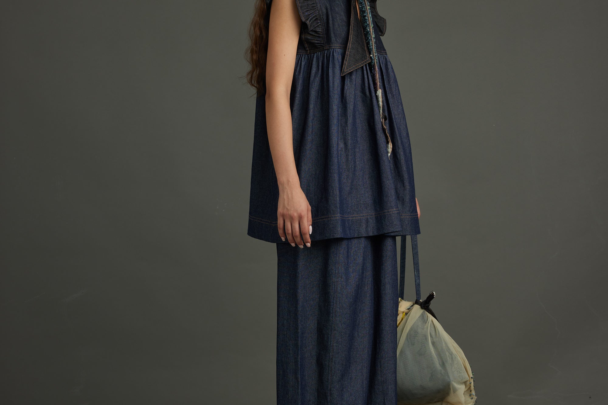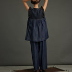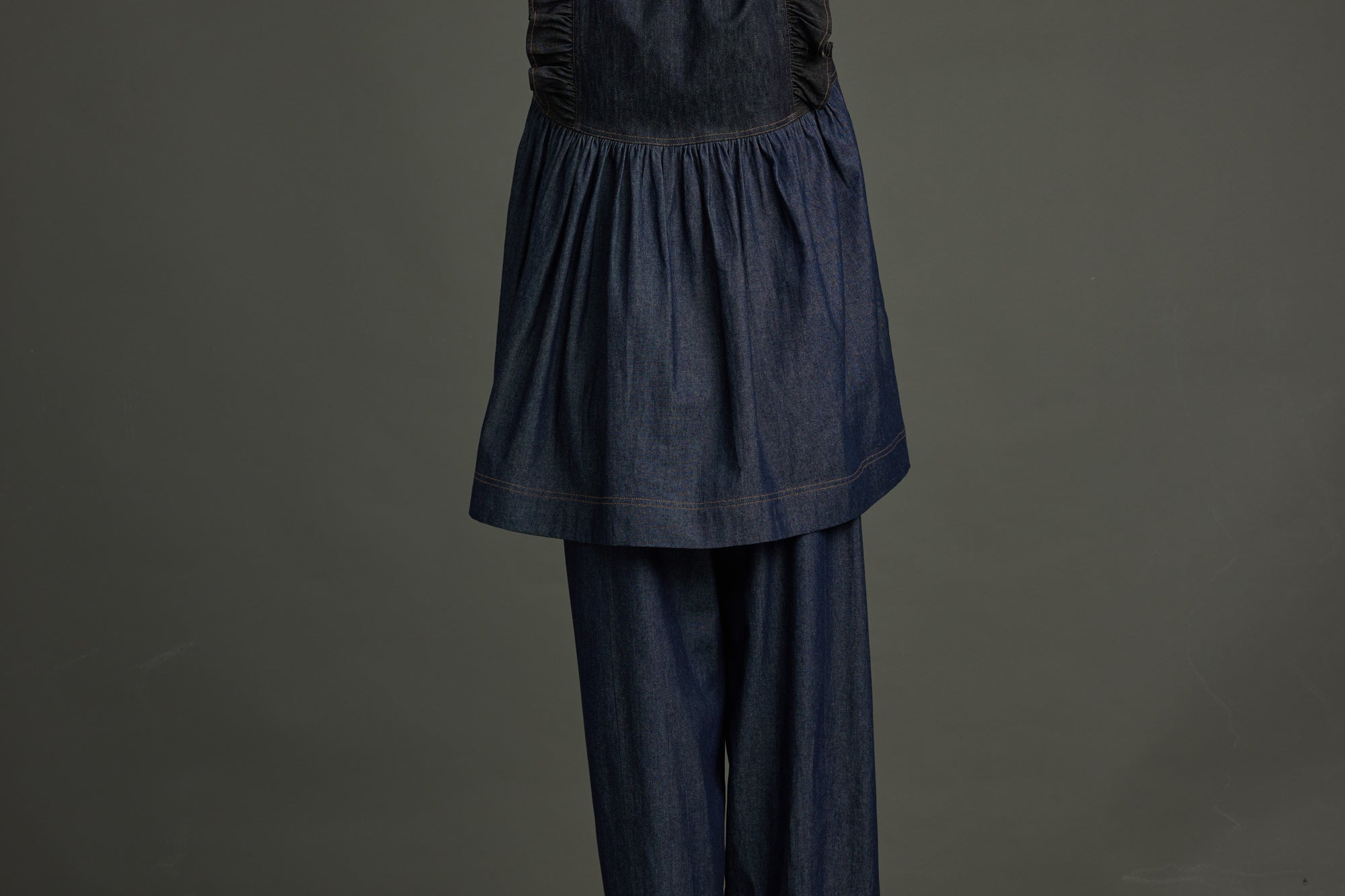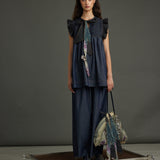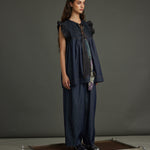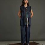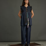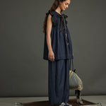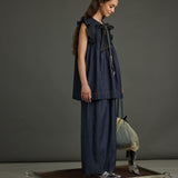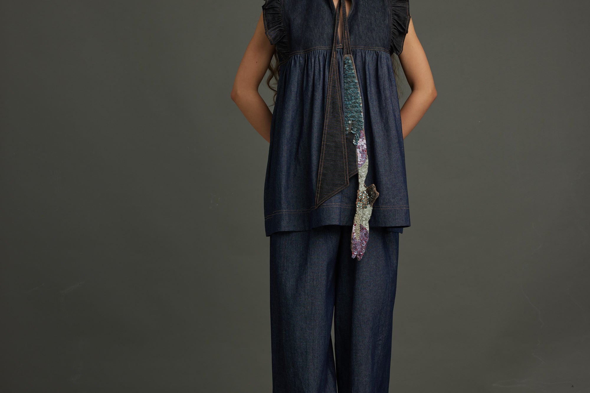 A dark wash-denim in a flare silhouette crafts the midnight top, with curved cap sleeves and a gathered empire waist, Intricate prism artwork higlights the front detail in an asyemmetric denim tie. Paired with a farshi style relaxed pants which has a drawstring provides a relaxed, adjustable fit.