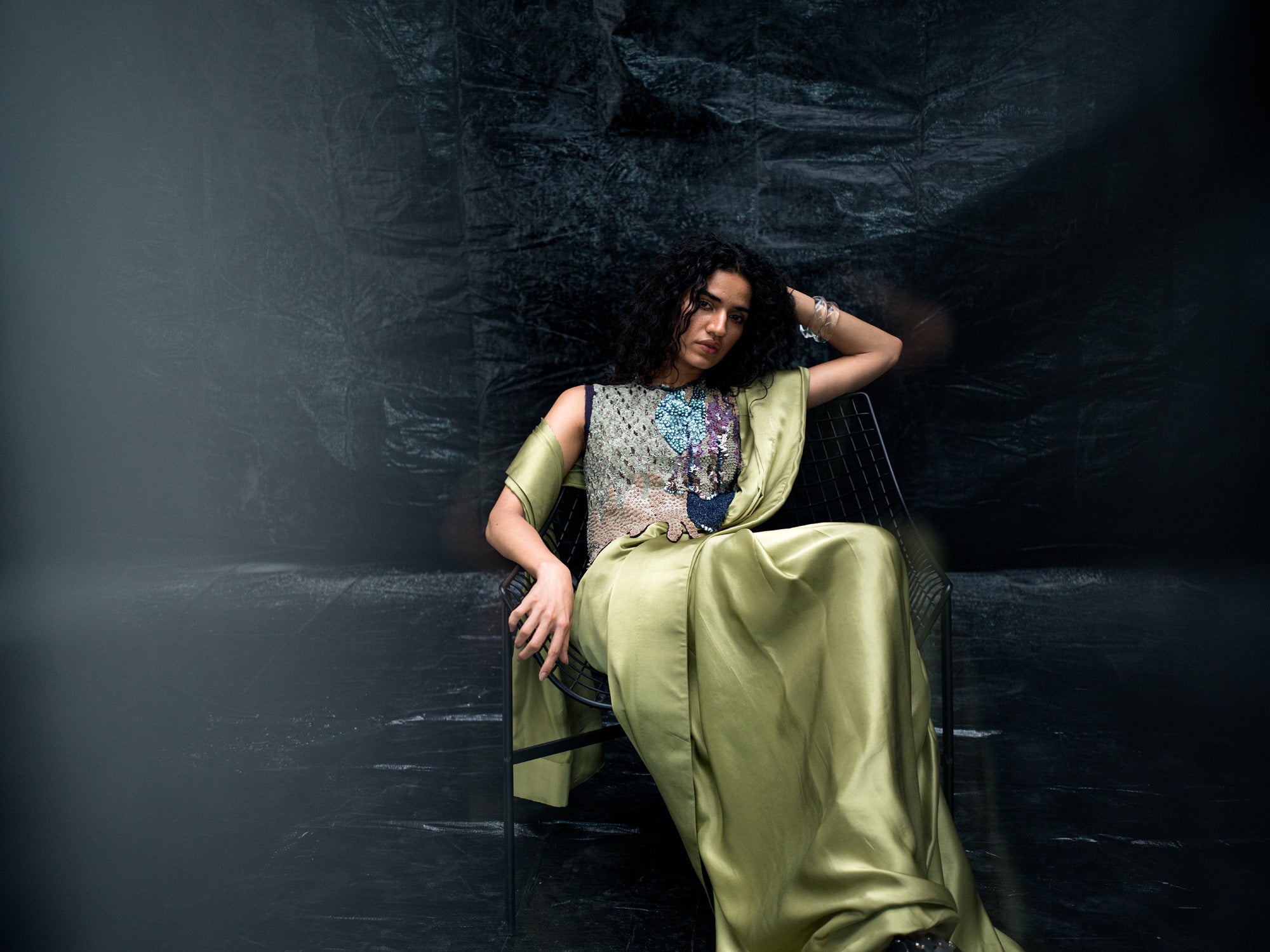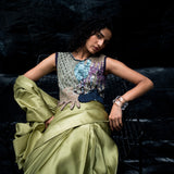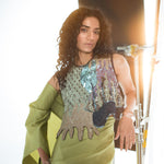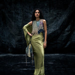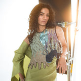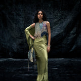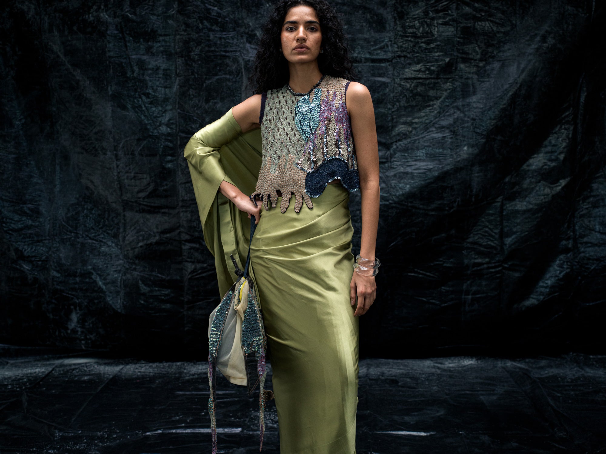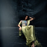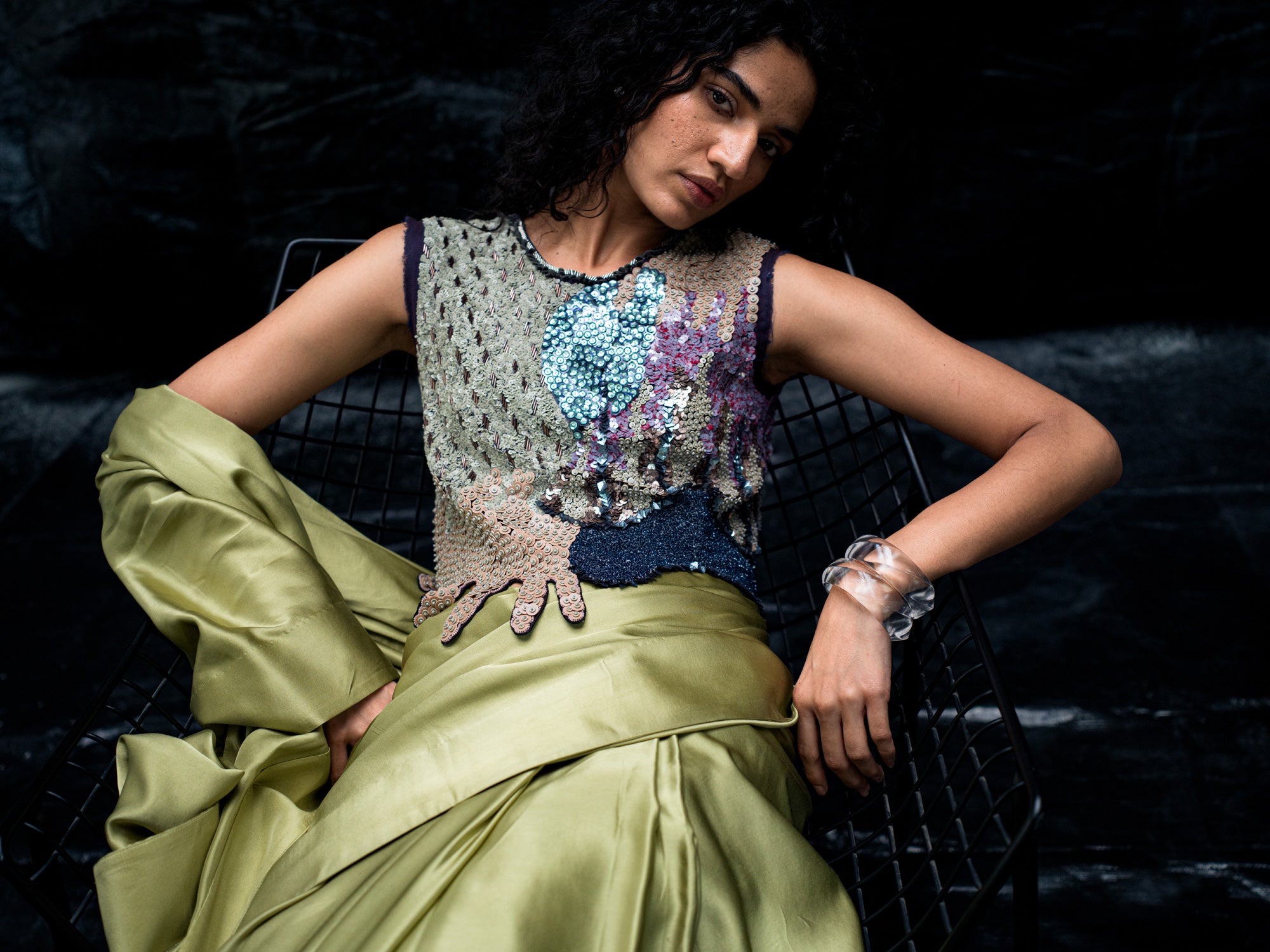 Multiples of sequin trickle in the moon fire blouse, meticulously hand-embellished marrying textures and tones. An asymmetrical, hand-beaded hem add to the detailing. Imagined as a saree blouse or a crop over GRAINE signature pants and skirts.