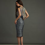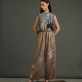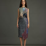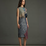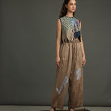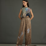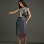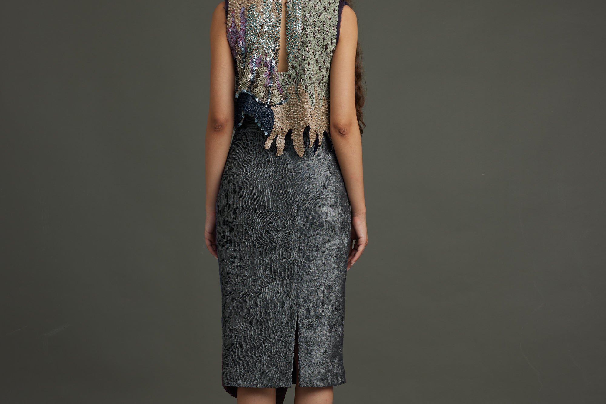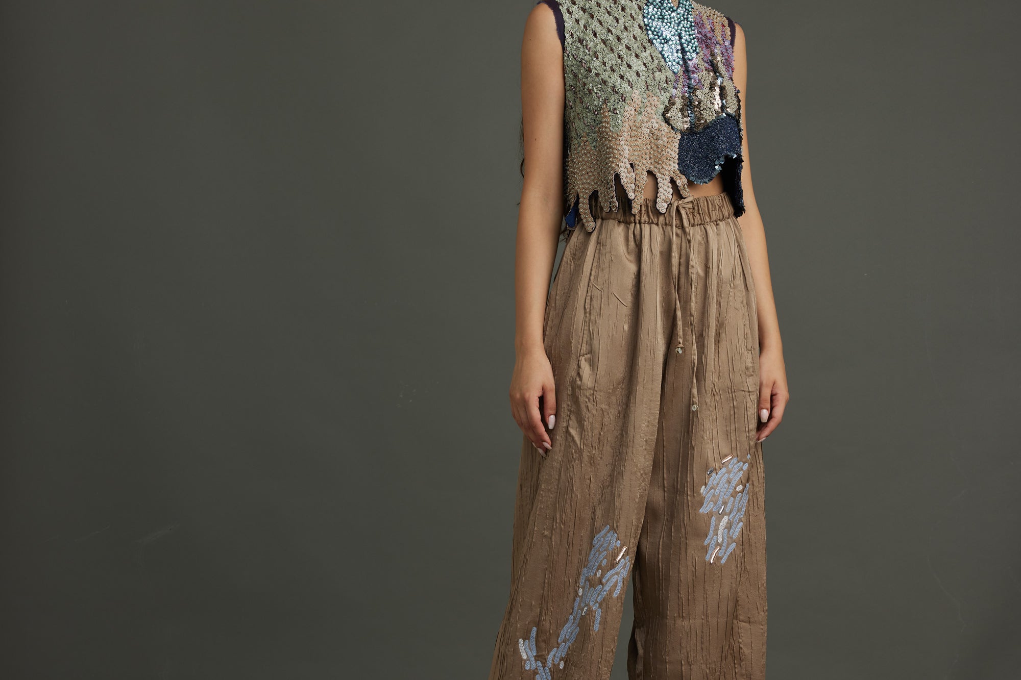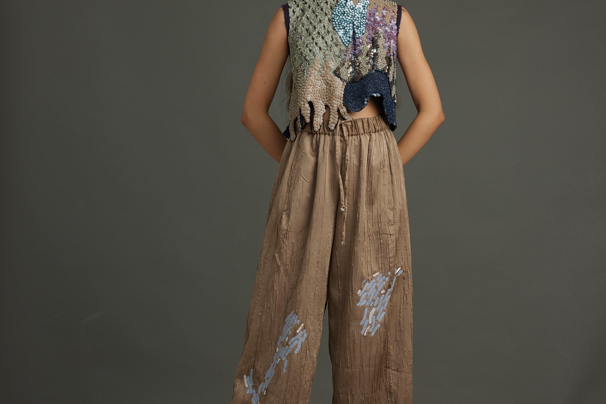 Multiples of sequin trickle in the moon fire blouse, meticulously hand-embellished marrying textures and tones. An asymmetrical, hand-beaded hem add to the detailing. Imagined as a saree blouse or a crop over GRAINE signature pants and skirts.