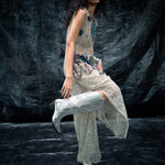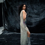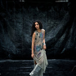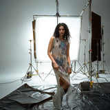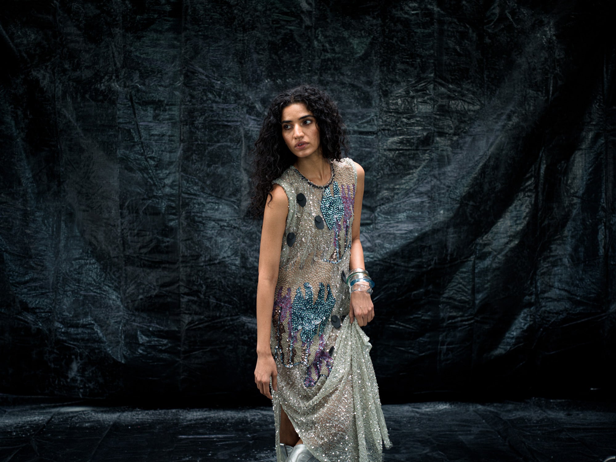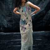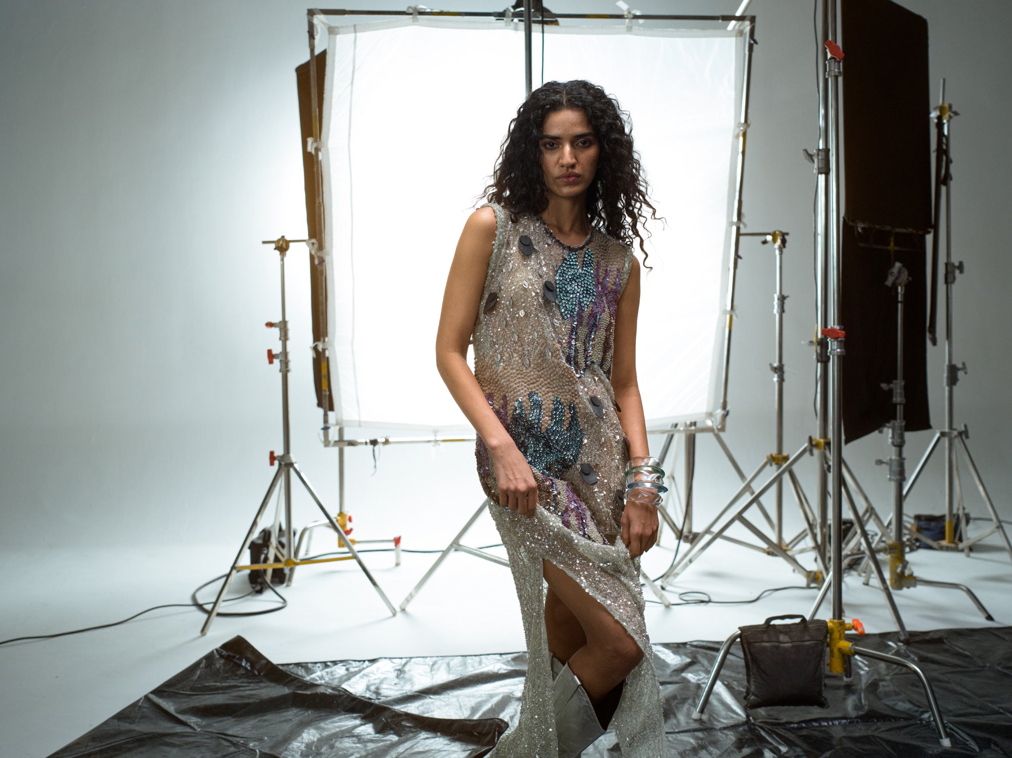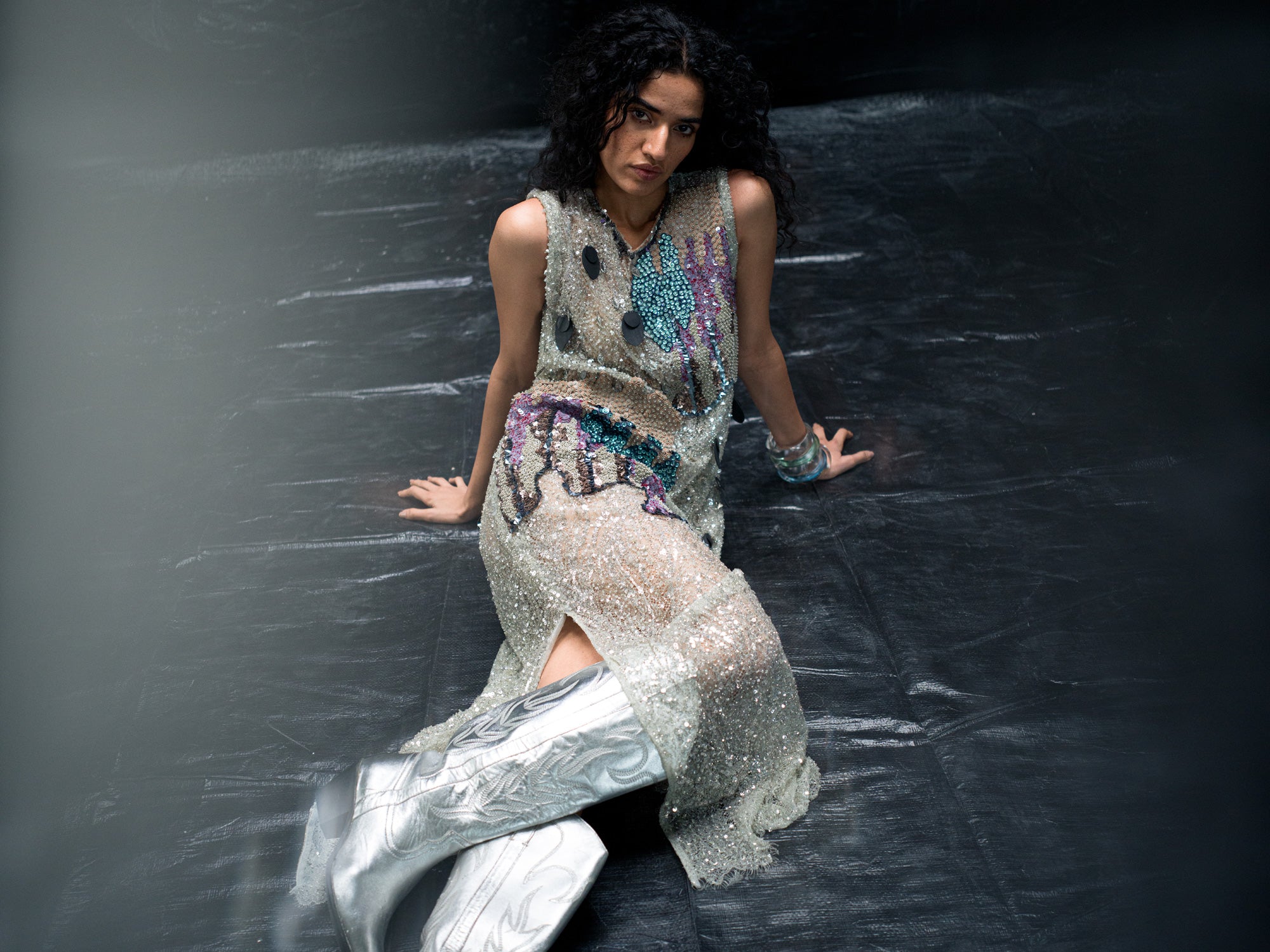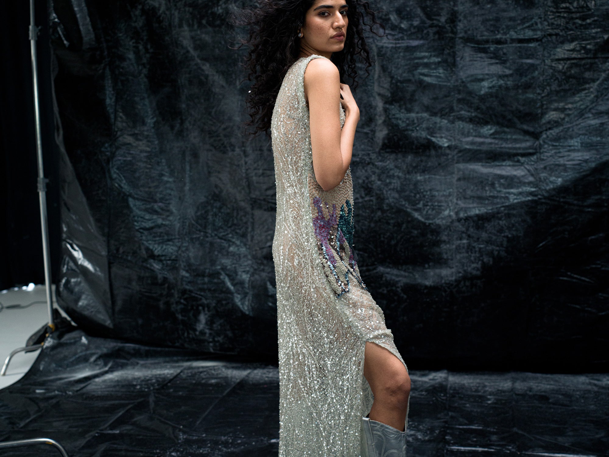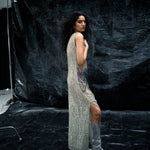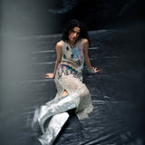 An evening ensemble enveloped in a luminous tapestry of all-over sequin in a fluid form. The design language is elevated by a series of abstract, metal work in vibrant blues and purples, complemented by GRAINE signature bold black rubber. The fluid, asymmetrical hemline adds a final touch of flow.