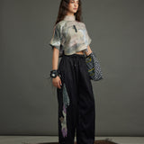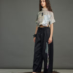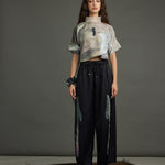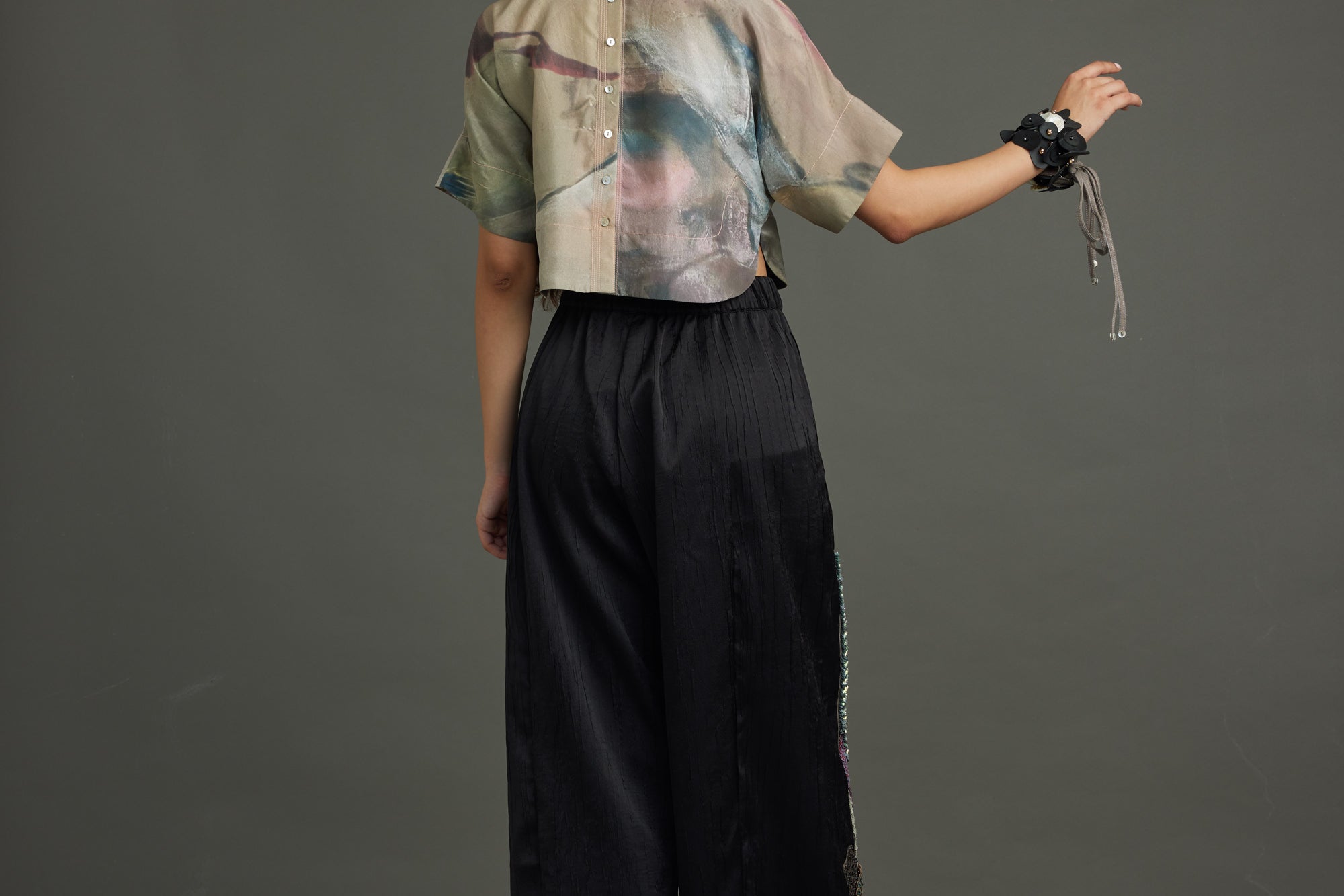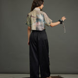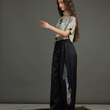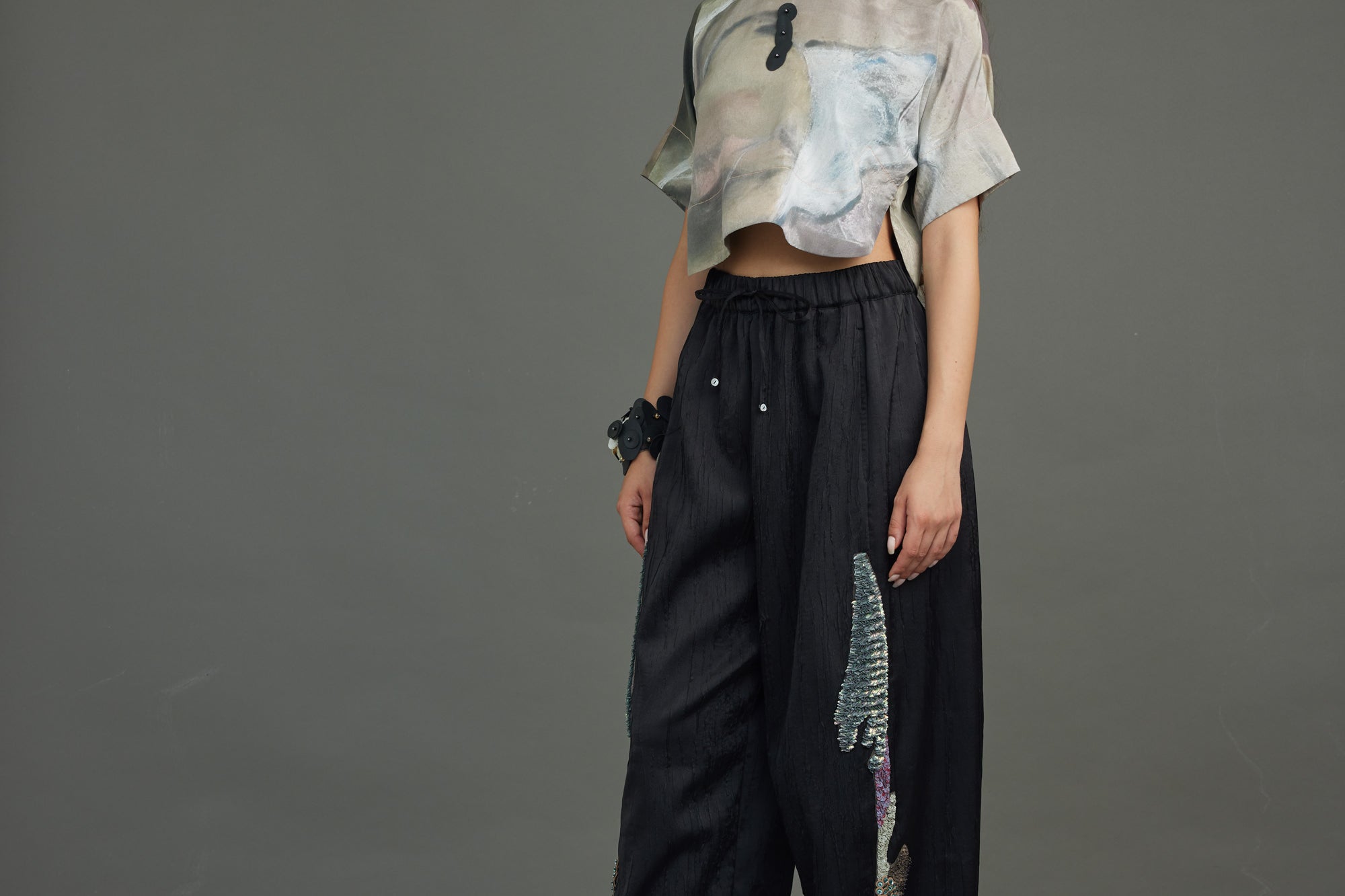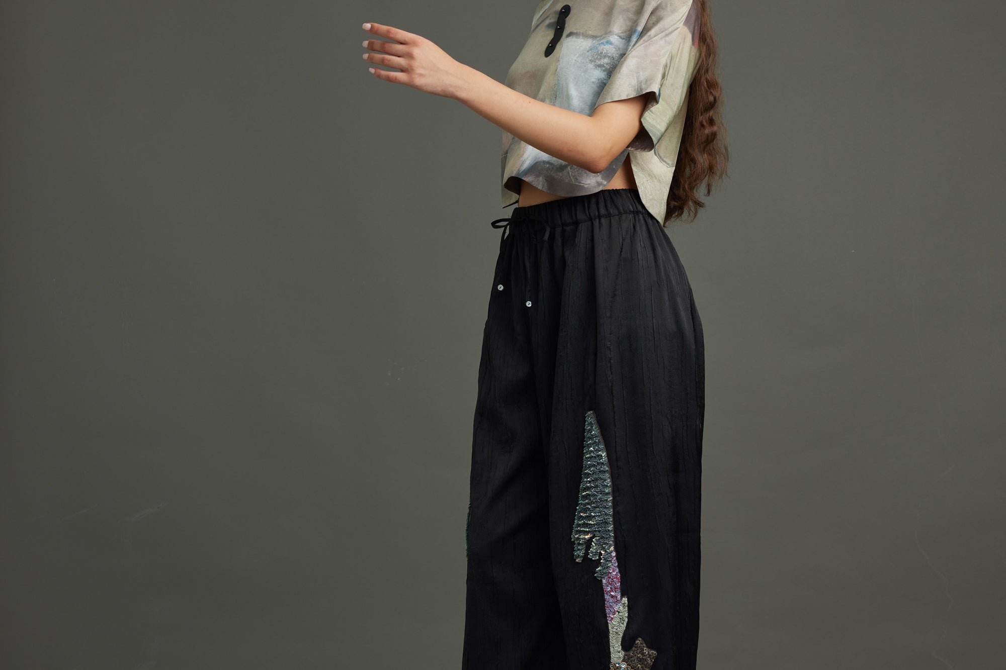 These Farshi-style pants in textured satin with inner lining in crepe feature graine signature artwork of metal and sequin hand embellishment. The elasticated waistband with drawstring provides a relaxed, adjustable fit. Princess seams on the front and back create a beautifully draped Farshi silhouette.