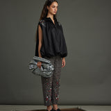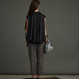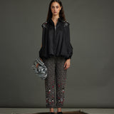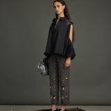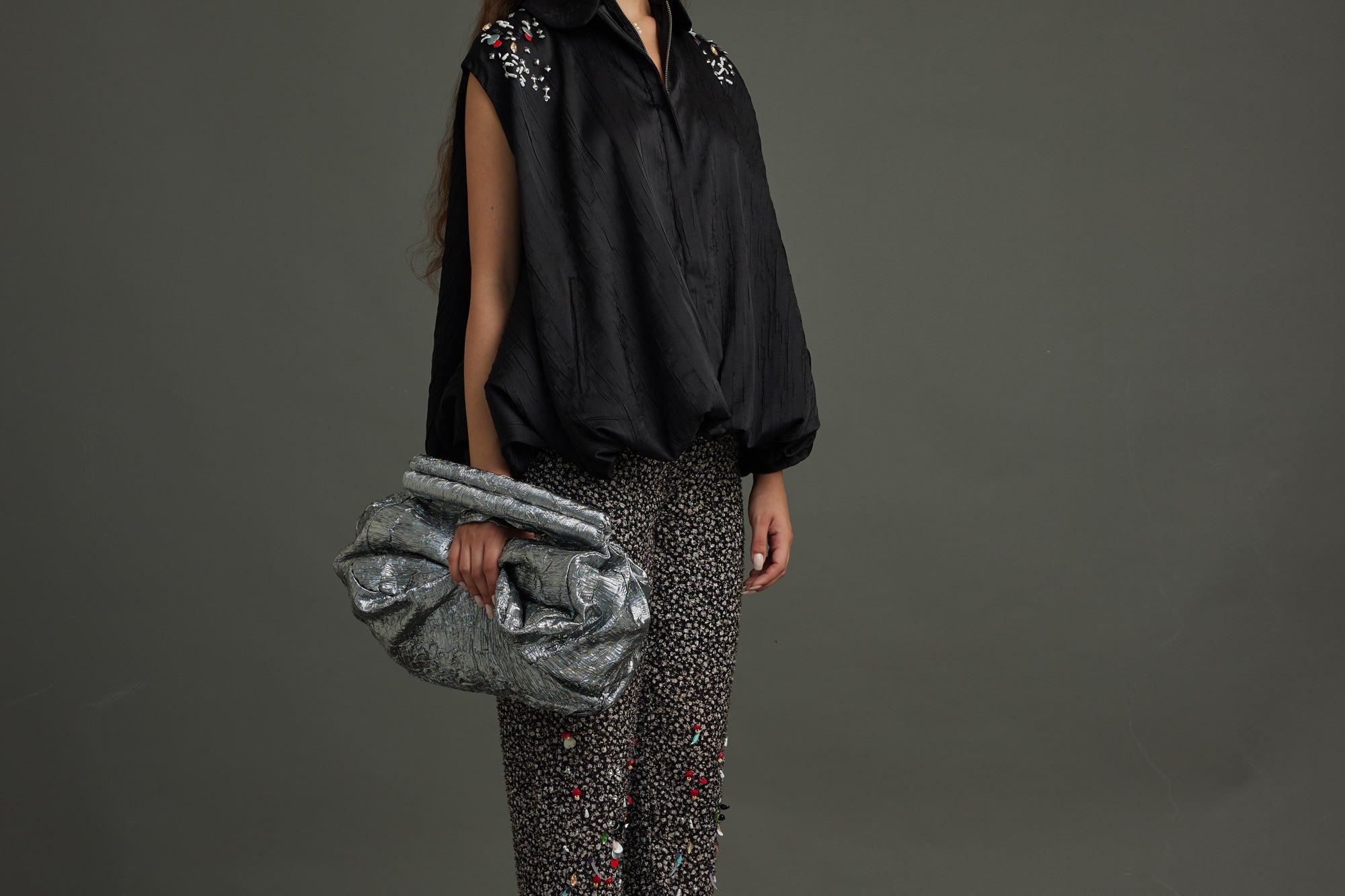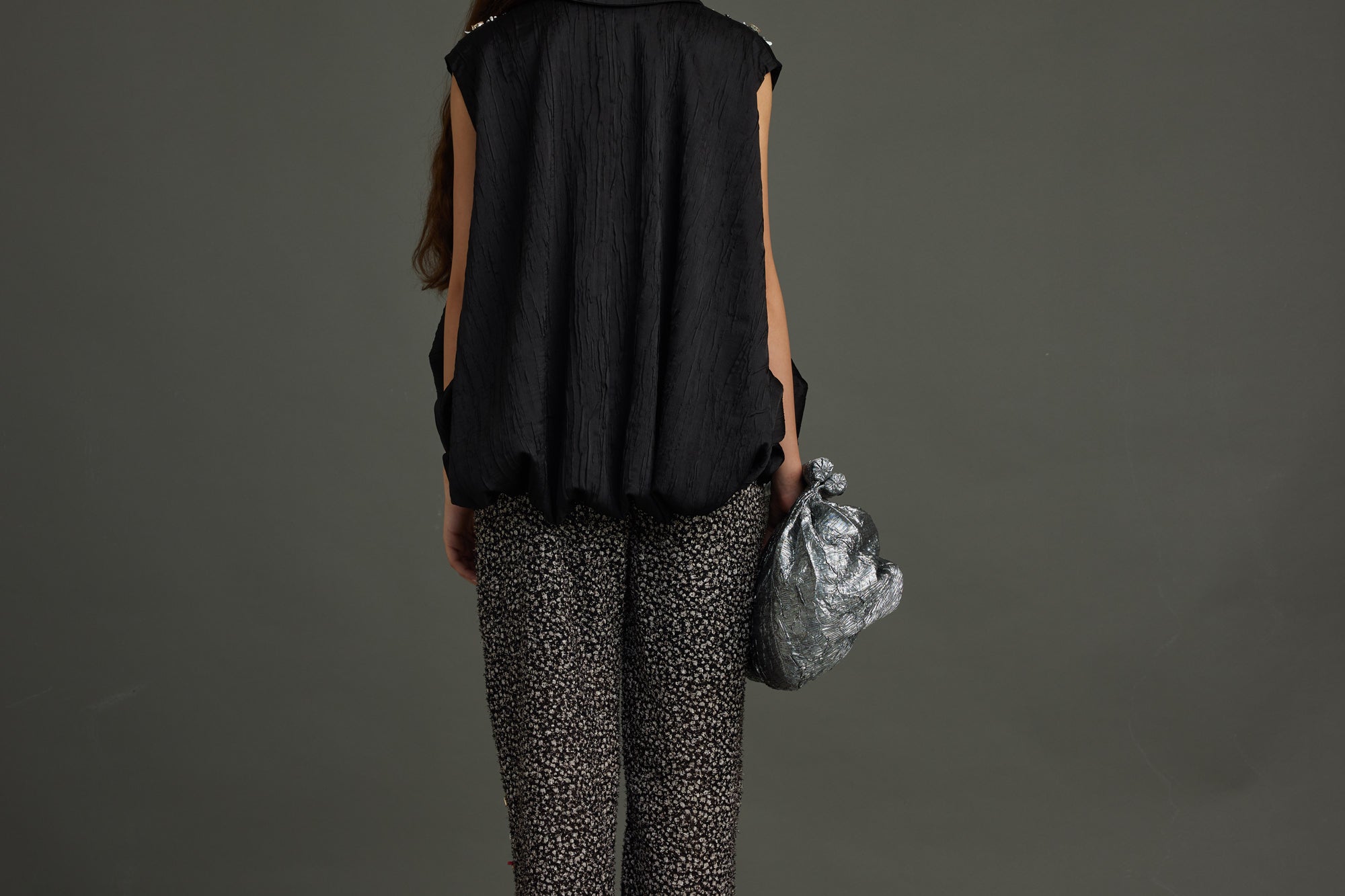 The jacket blouse plays with proportion and volume, creating a dramatic balloon-like silhouette. The clean yet sculptural zipper-front design is elevated by intricate red rain artwork on the shoulders, where the splattered metal creates a abstract pattern. The wide, classic collar frames the face.