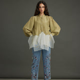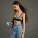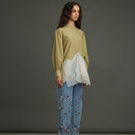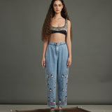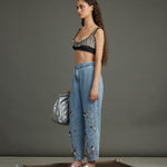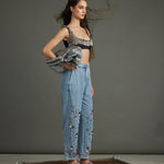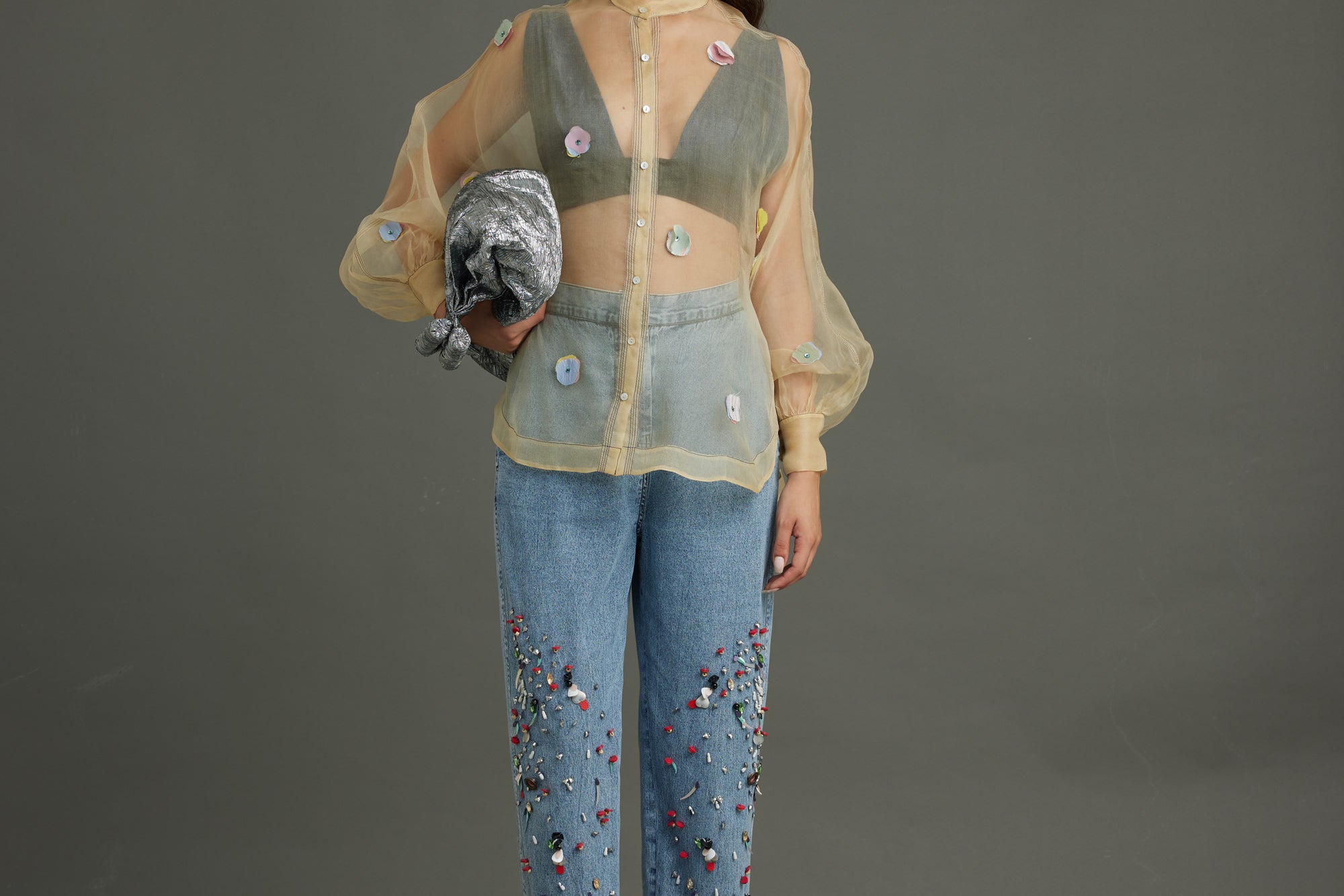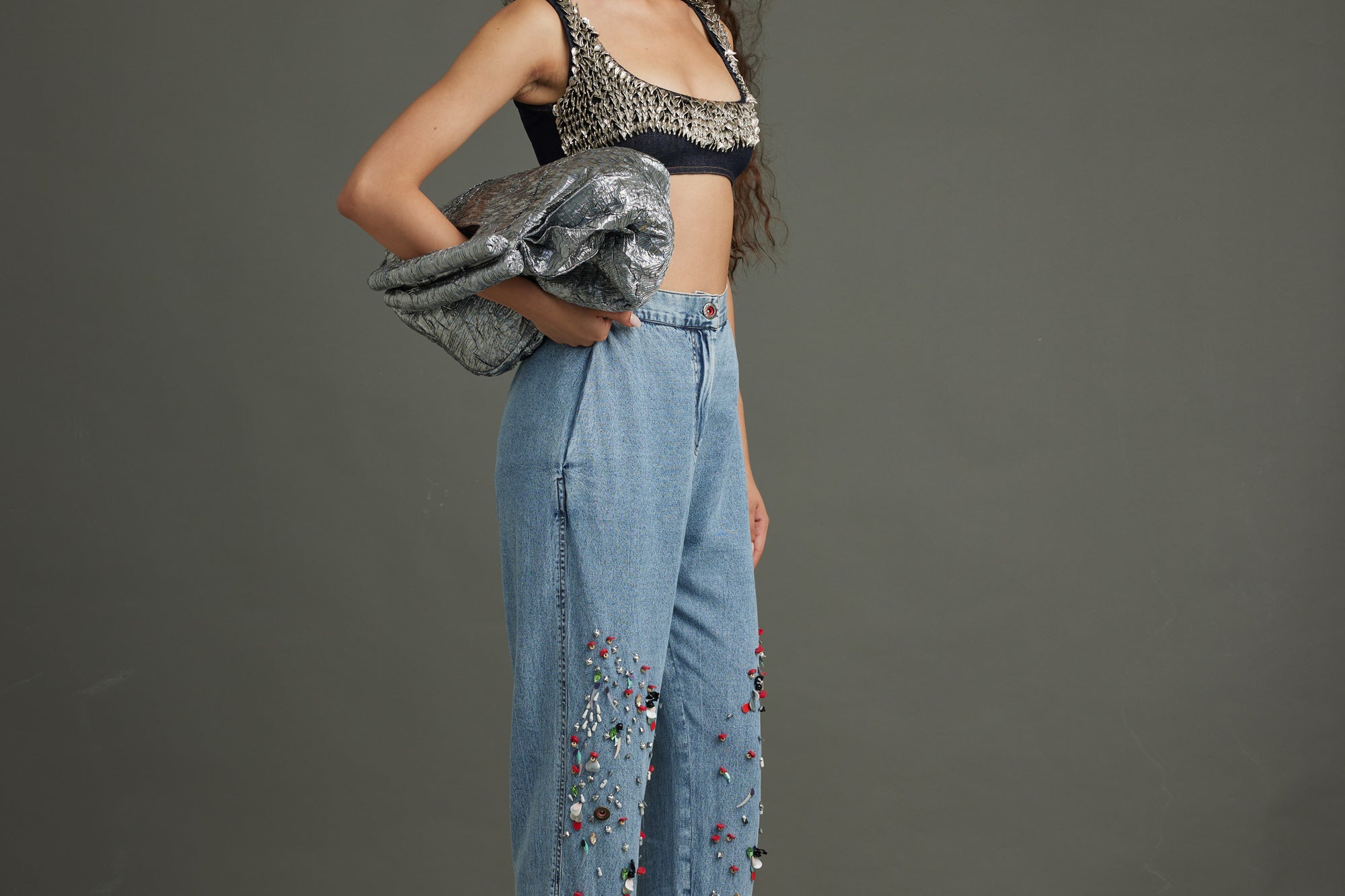 These acid washed denim pants are an eclectic statement. The classic blue denim is reimagined with a contemporary, anti-fit silhouette that features metal and sequins work splattered over the pants, This hand-applied detail brings a unique, statement-making finish.