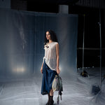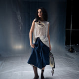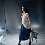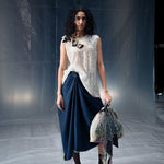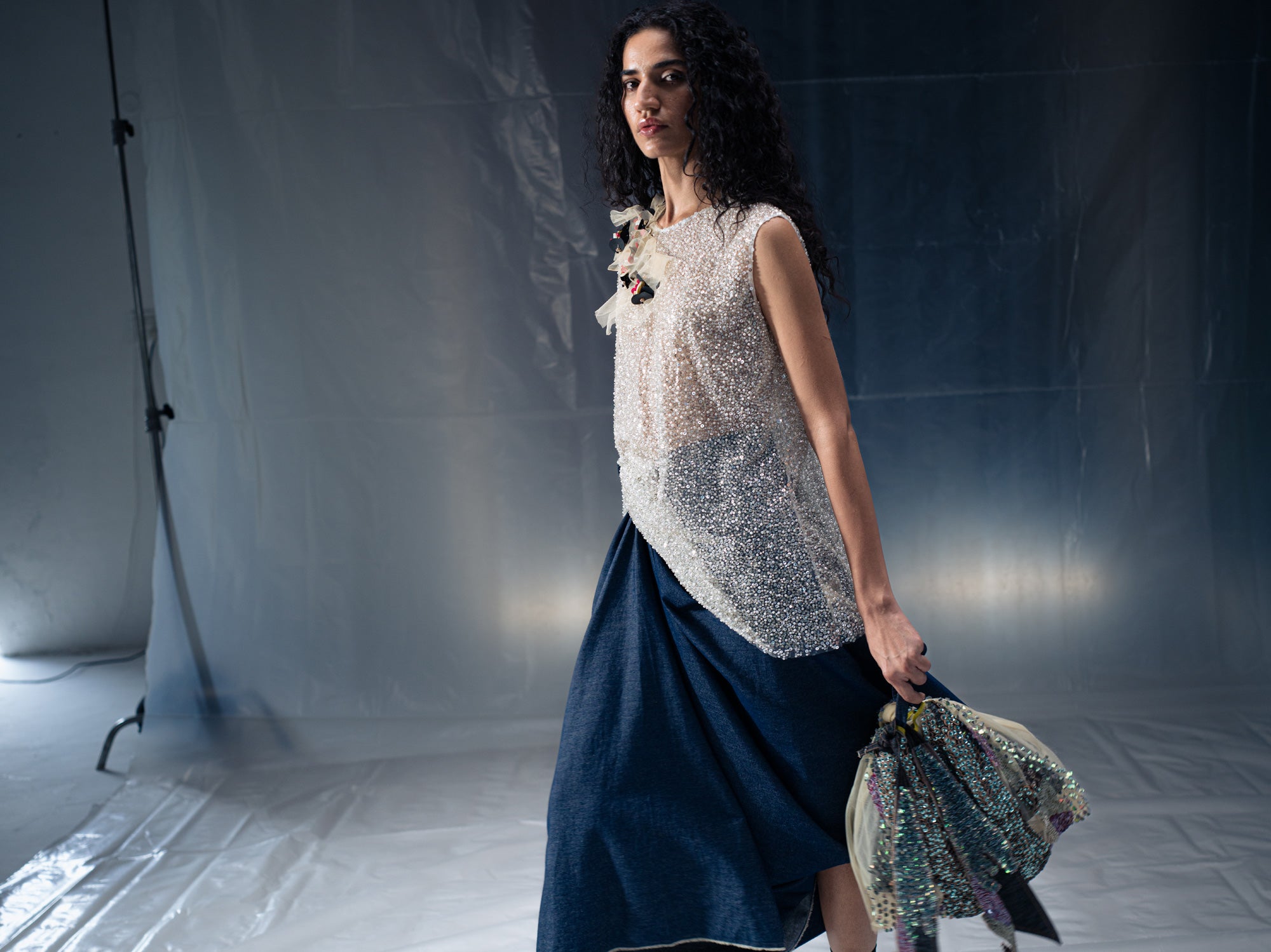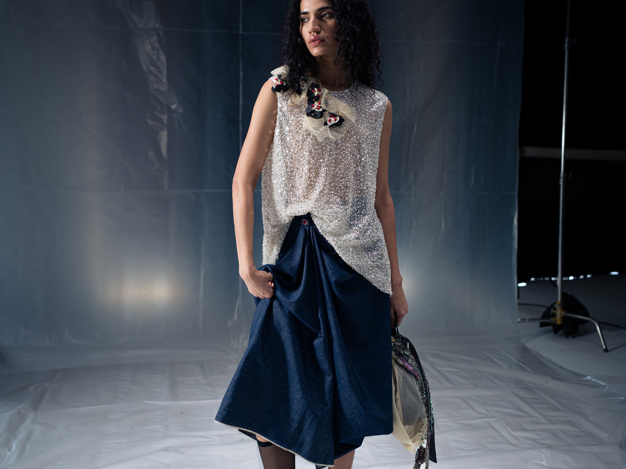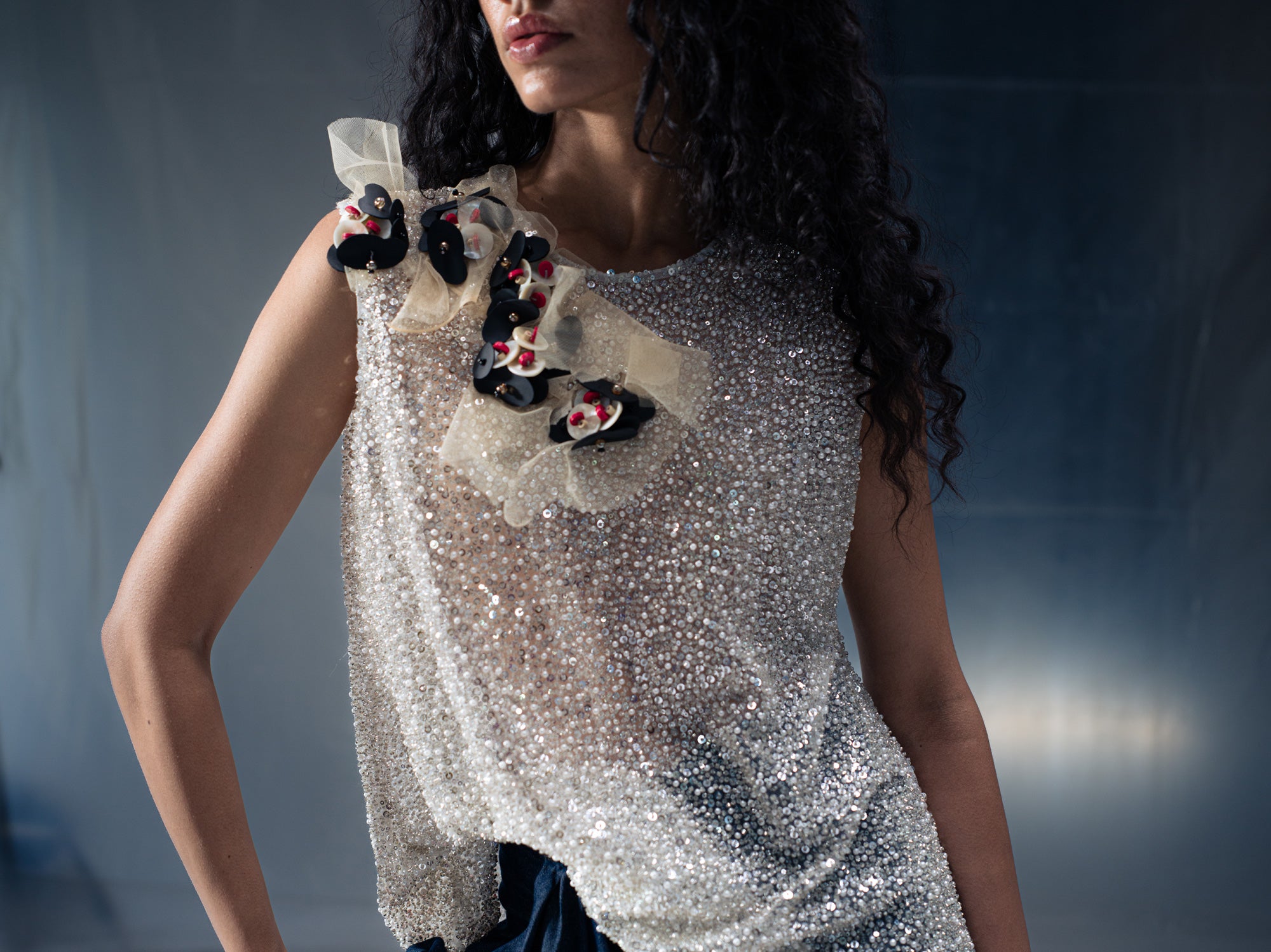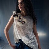 A sleeveless shift dress with a luminous, all-over finish of sequin. The neckline is transformed by a striking arrangement of hand-crafted rubbers and buttons, creating a raw and edgy contrast that effortlessly sets the dress apart.
