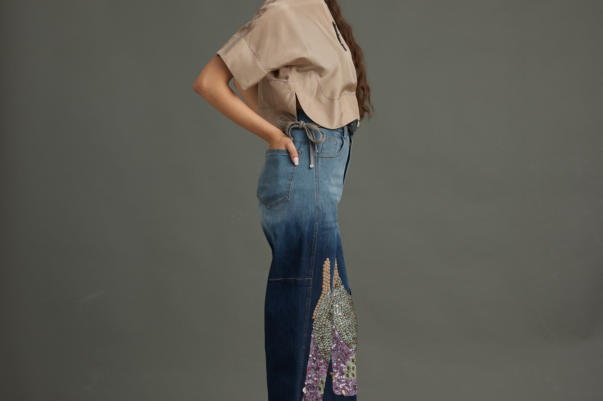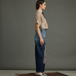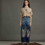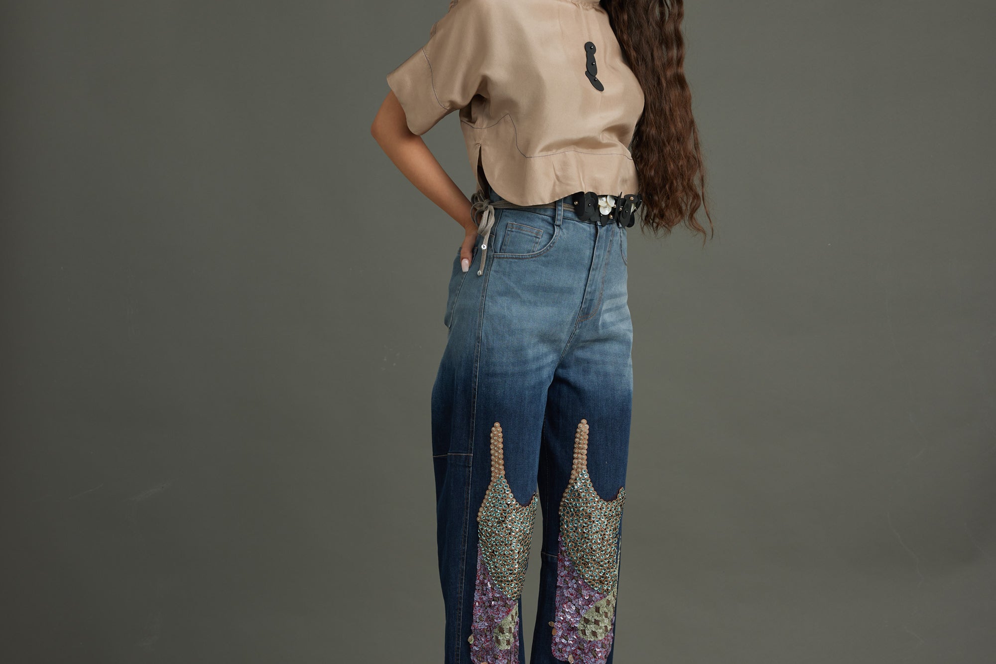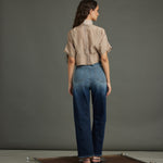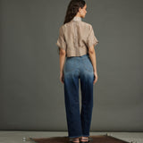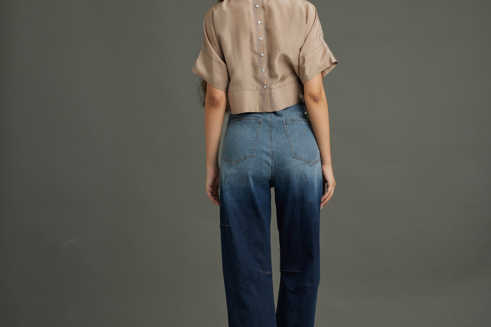 The silk crop top made in subtle natural beige with a crisp, high collar frames the neck, while the wide, kimono-style short sleeves lend an effortless, relaxed drape. button down blouse at back.