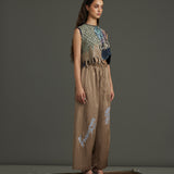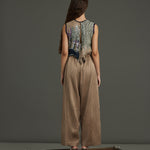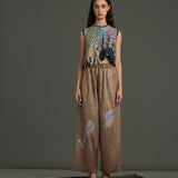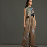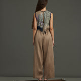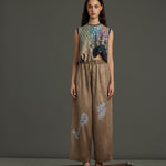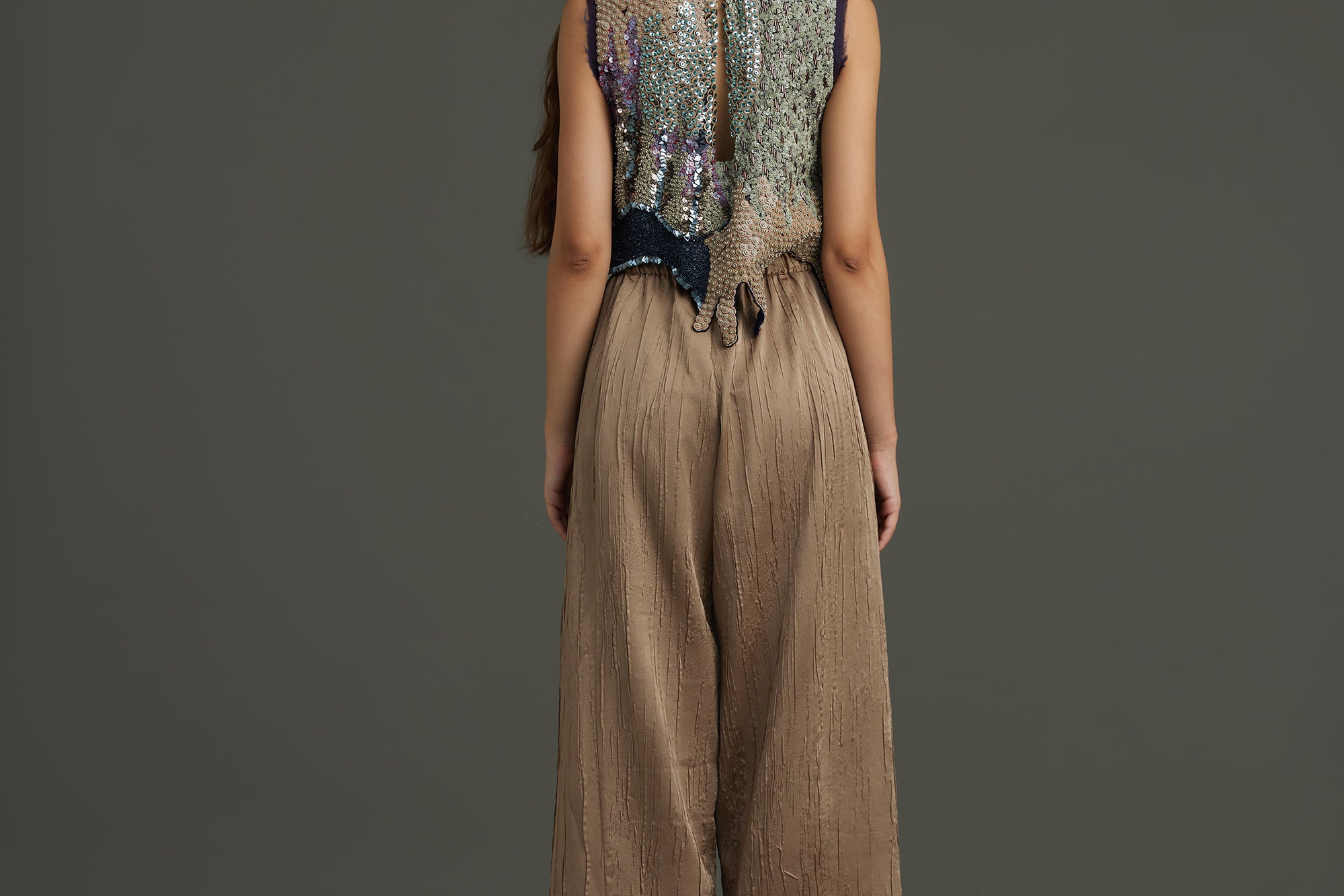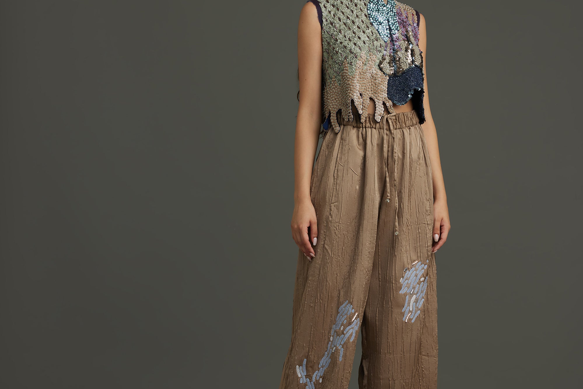 These Farshi-style pants in comfortable satin with inner lining in crepe feature graine signature artwork of the delicate Chikankari work on front panels. The elasticated waistband with drawstring provides a relaxed, adjustable fit. Princess seams on the front and back create a beautifully draped Farshi silhouette.