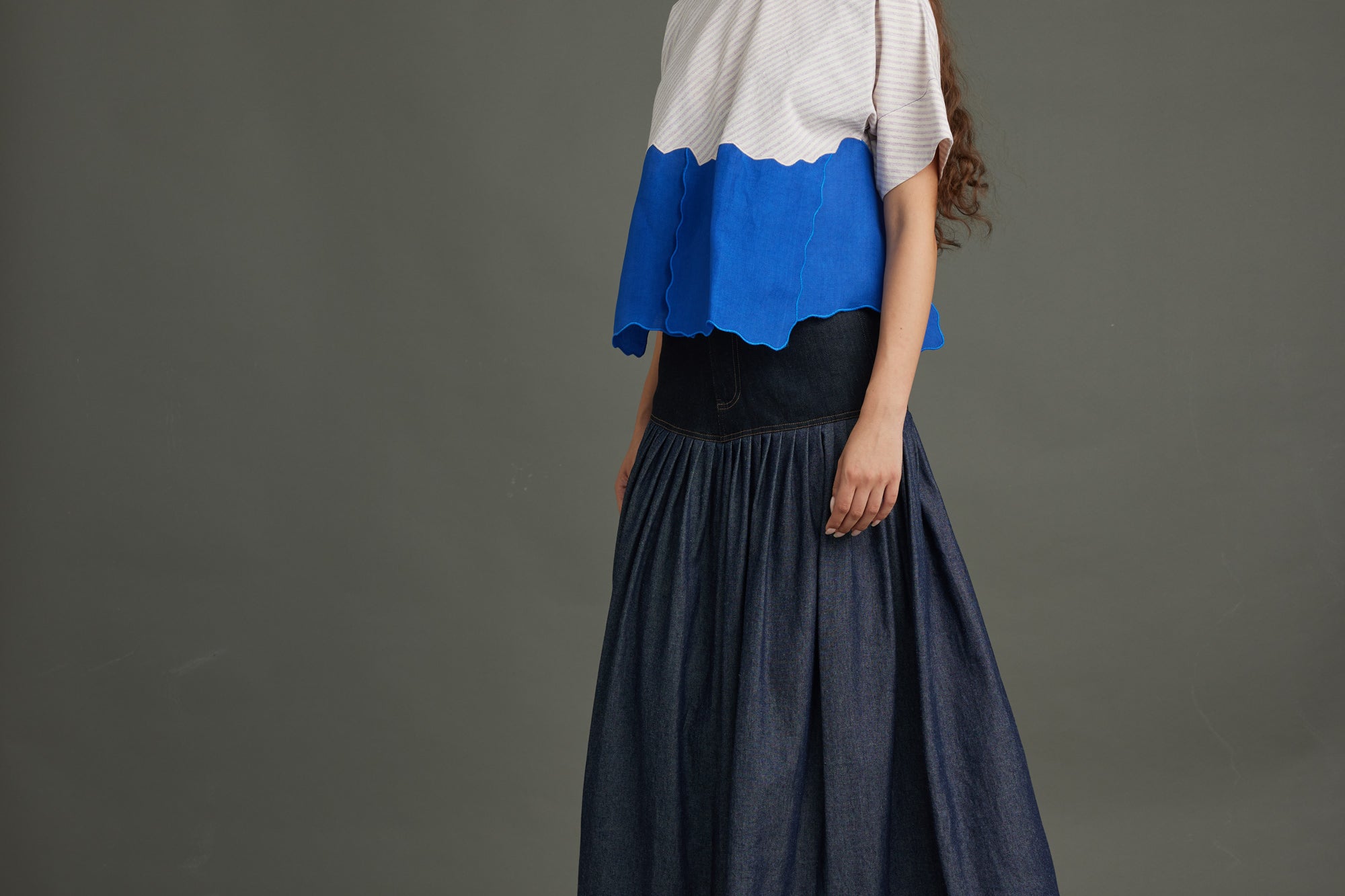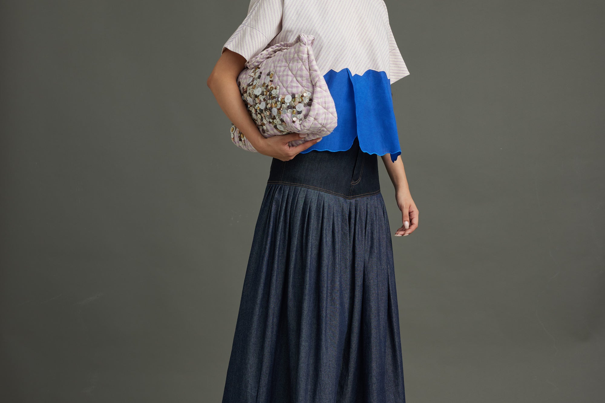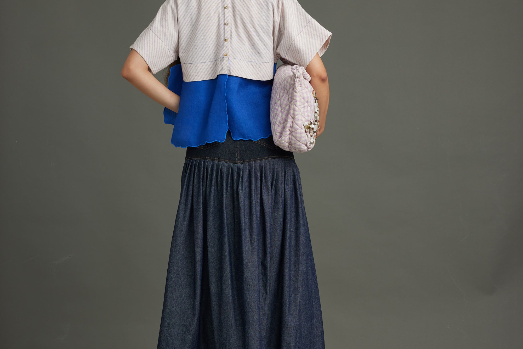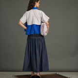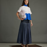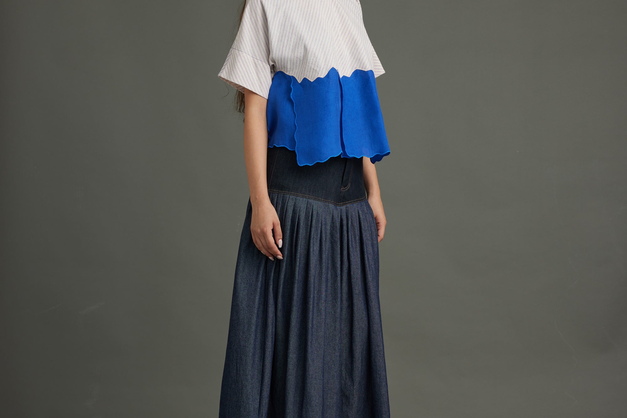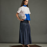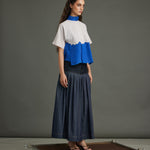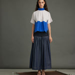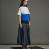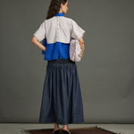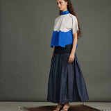 Striking purple diagonal stripes meet an electric blue organza "river" detail, bisecting the front. A coordinating blue organza neck band and MOP button back closure complete this bold, textural crop top.