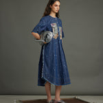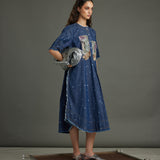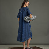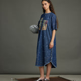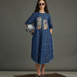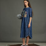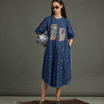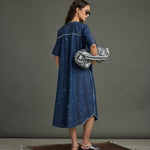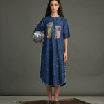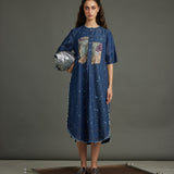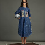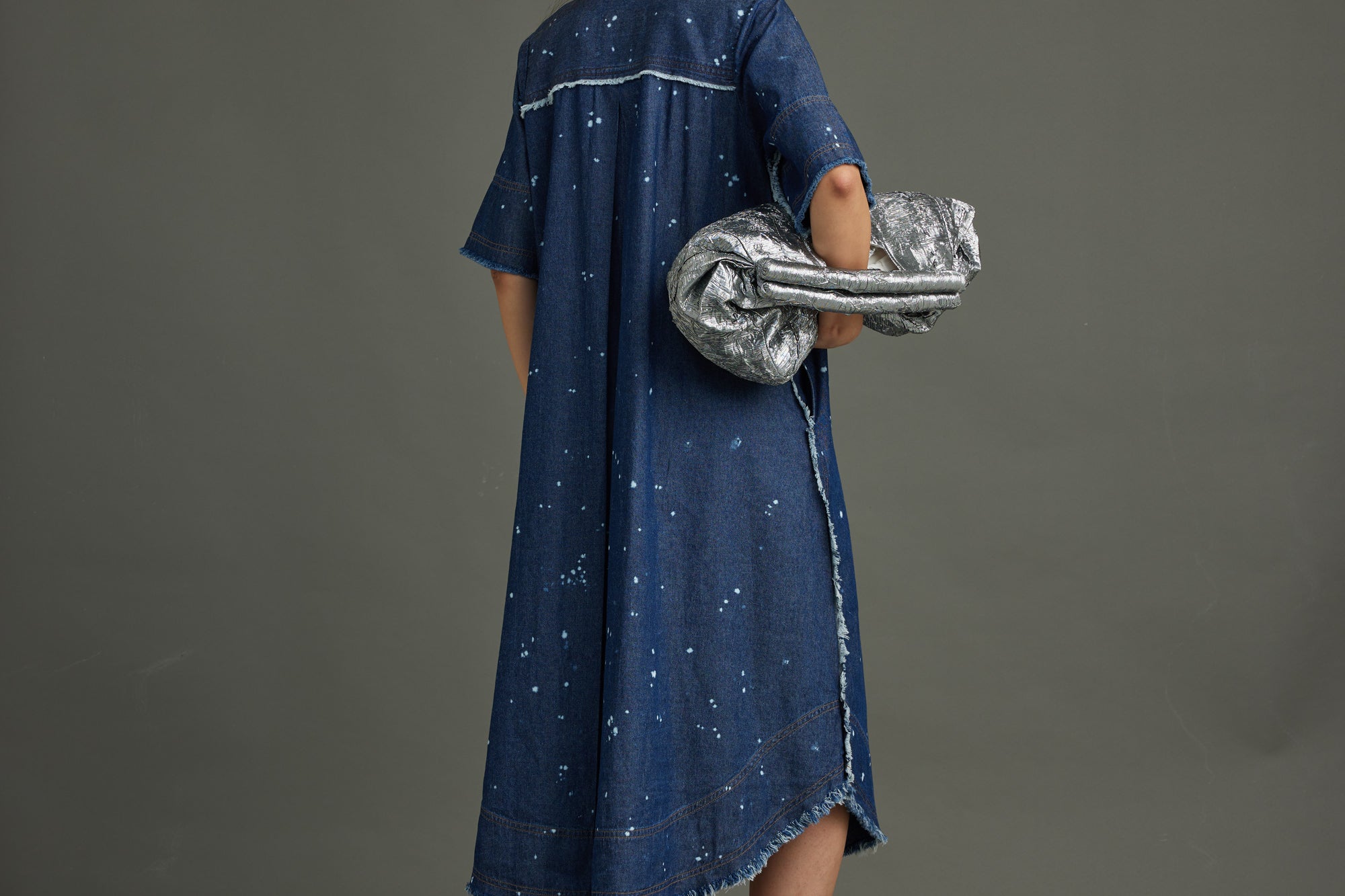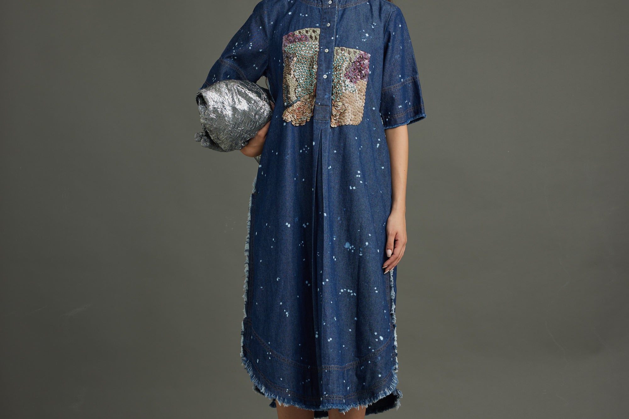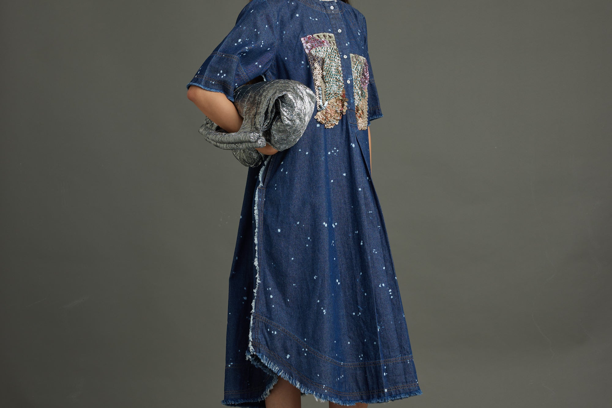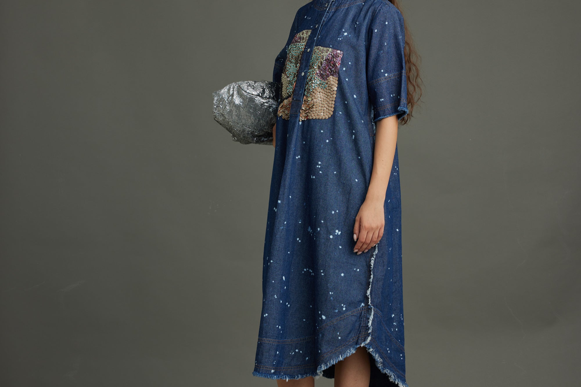 The spill denim dress is an easy flare dress in a relaxed fit and features a band collar, and striking embroidered patches on the front in multiplying sequin. A contemporary frayed hem adds an edge detail, an easy wardrobe addition.