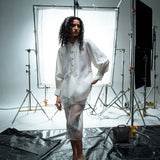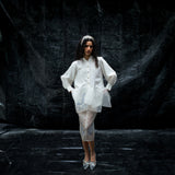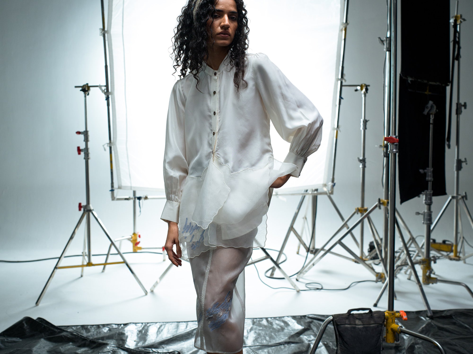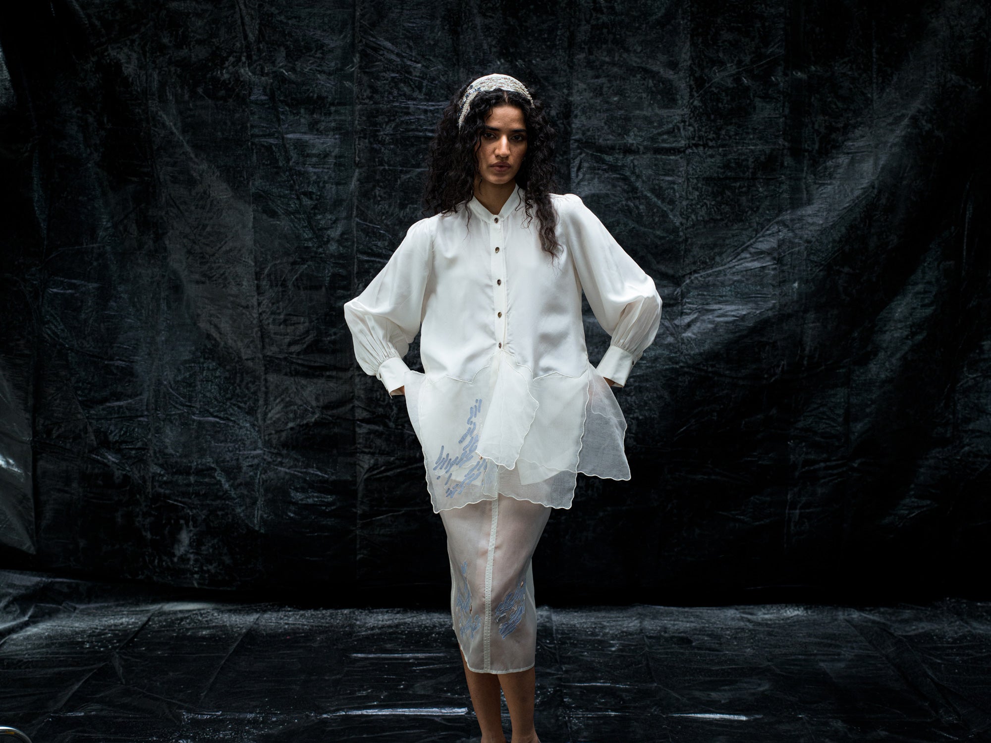Ethereal pencil skirt in 100% silk organza with a comfortable knit waist yoke. French fit seams create shadow play, while the delicate Chikankari and shimmering Mukaish work are thoughtfully placed creating a captivating visual narrative where traditional embroidery meets contemporary design.